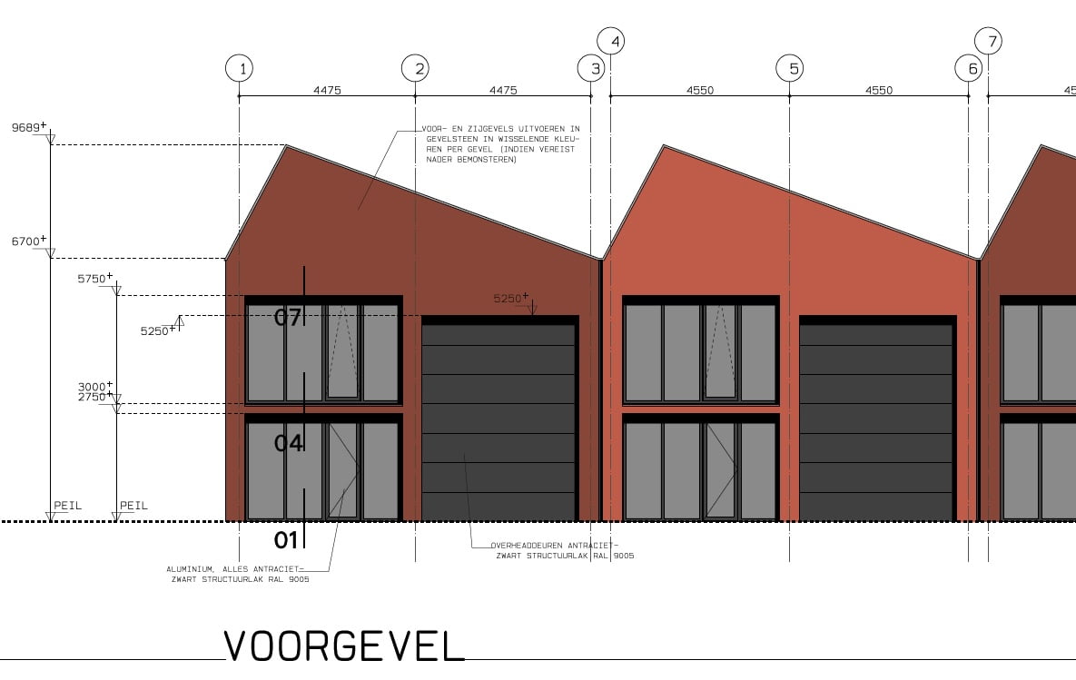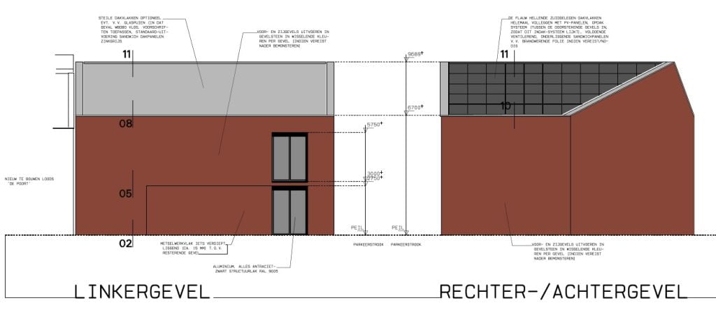 - Gevels deels Metselwerk (Rc 4,5) en deels in sandwichpanelen (voor- en vrije zijgevels metselwerk).
