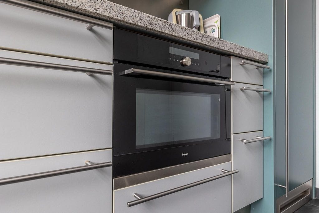 Aan de voorzijde is er een 2e kamer, die ideaal te gebruiken is als kantoortje (2,42 x 2,25 m). Op deze verdieping is een 2e toilet en bevindt zich ook de keuken. De keuken, van het merk Bulthaup, verkeert in een nette staat en is voorzien van een modern wit keukenblok met granieten aanrechtblad, laden en bovenkastjes met glasdeurtjes. Aan apparatuur is er een gaskookplaat (2 jaar oud), oven (2 jaar oud), RVS afzuigkap (type schouwkap) en koelkast (2 jaar oud)