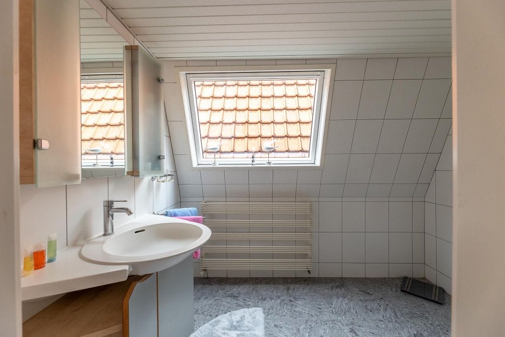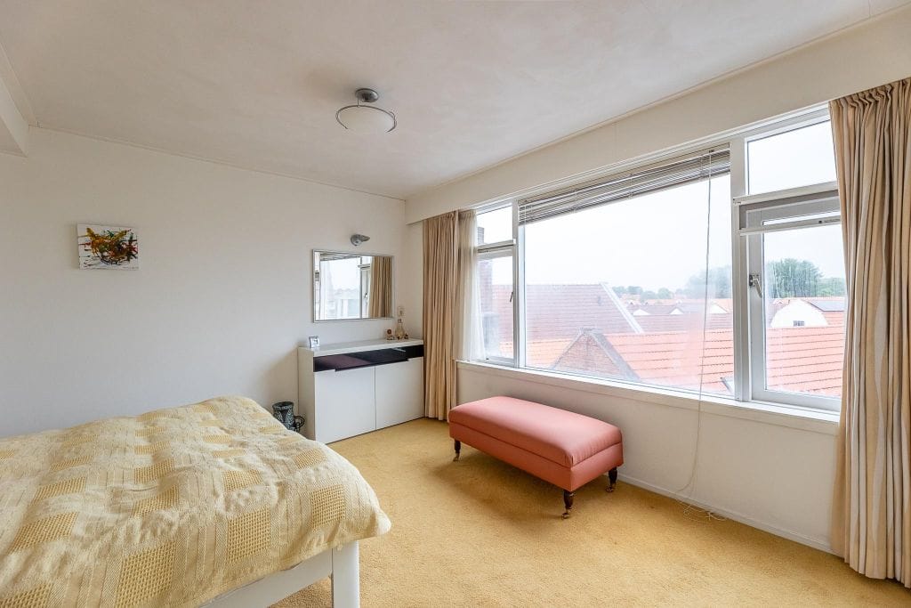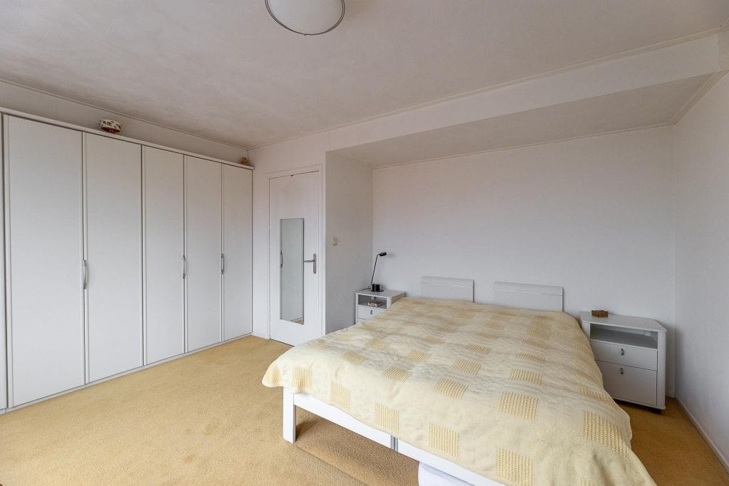 Een ruime overloop leidt naar 2 prima slaapkamers aan de voorzijde, een grote slaapkamer met vaste kastenwand aan de achterzijde, een nette badkamer met douche met glazen scherm en wastafel in een meubeltje en groot Velux raam, een bergkast tegen de badkamer aan (misschien een idee om hier een 3e toilet te plaatsen) en een berging.