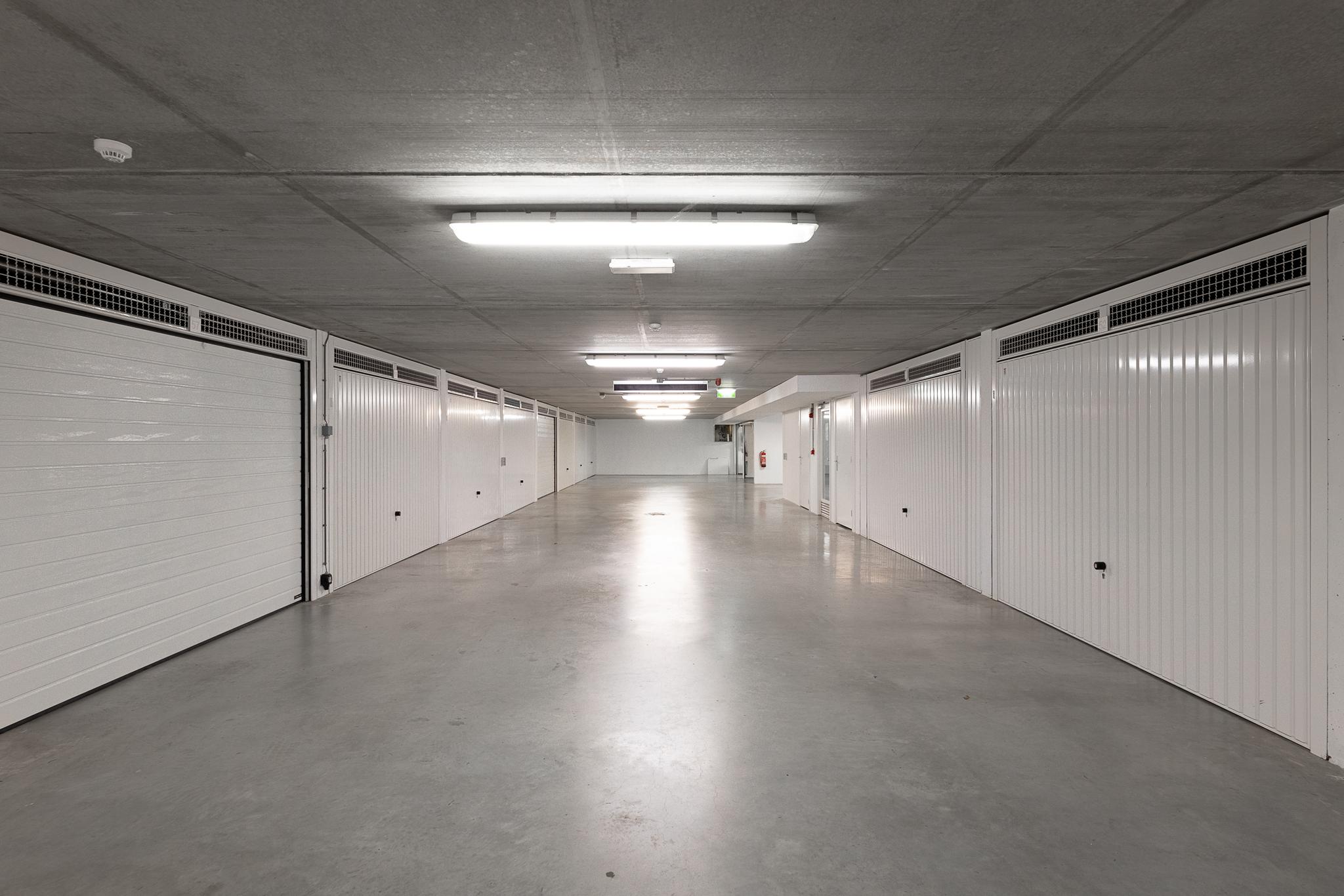 In de kelder van dit complex bevinden zich de garages. Een van de grotere garageboxen is optioneel te koop voor € 27.500 k.k.