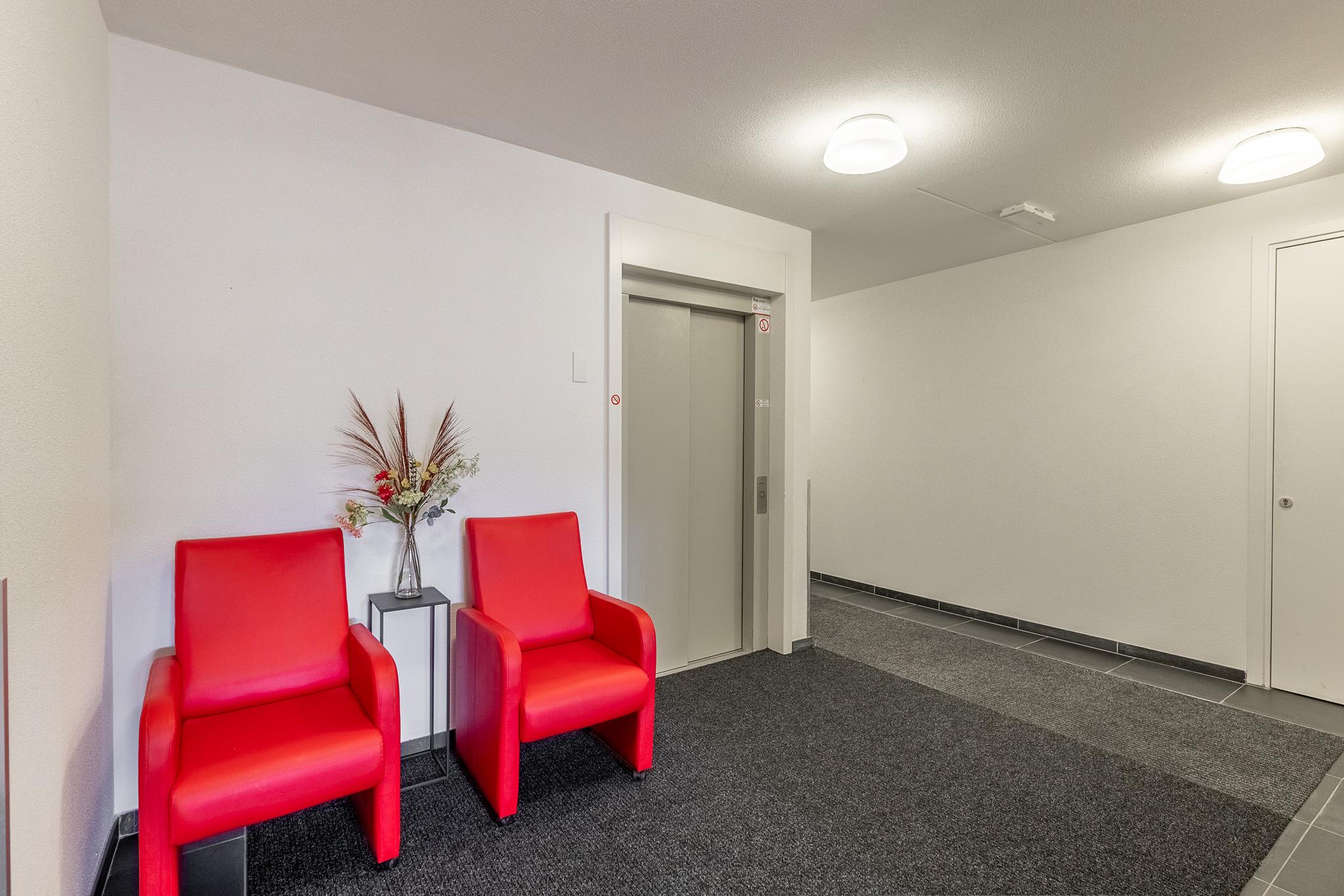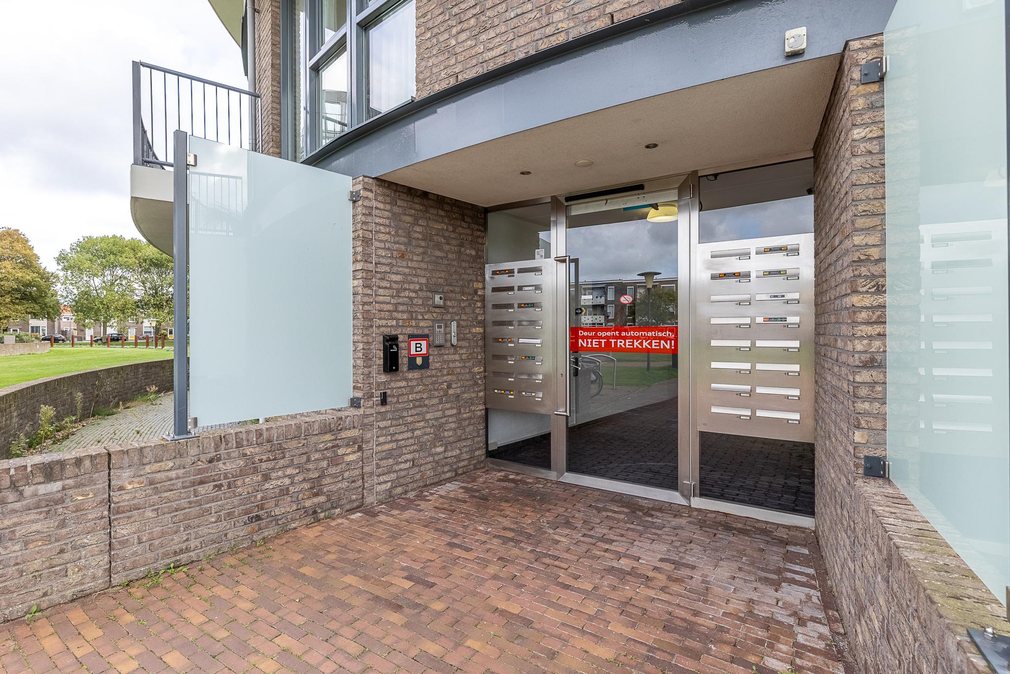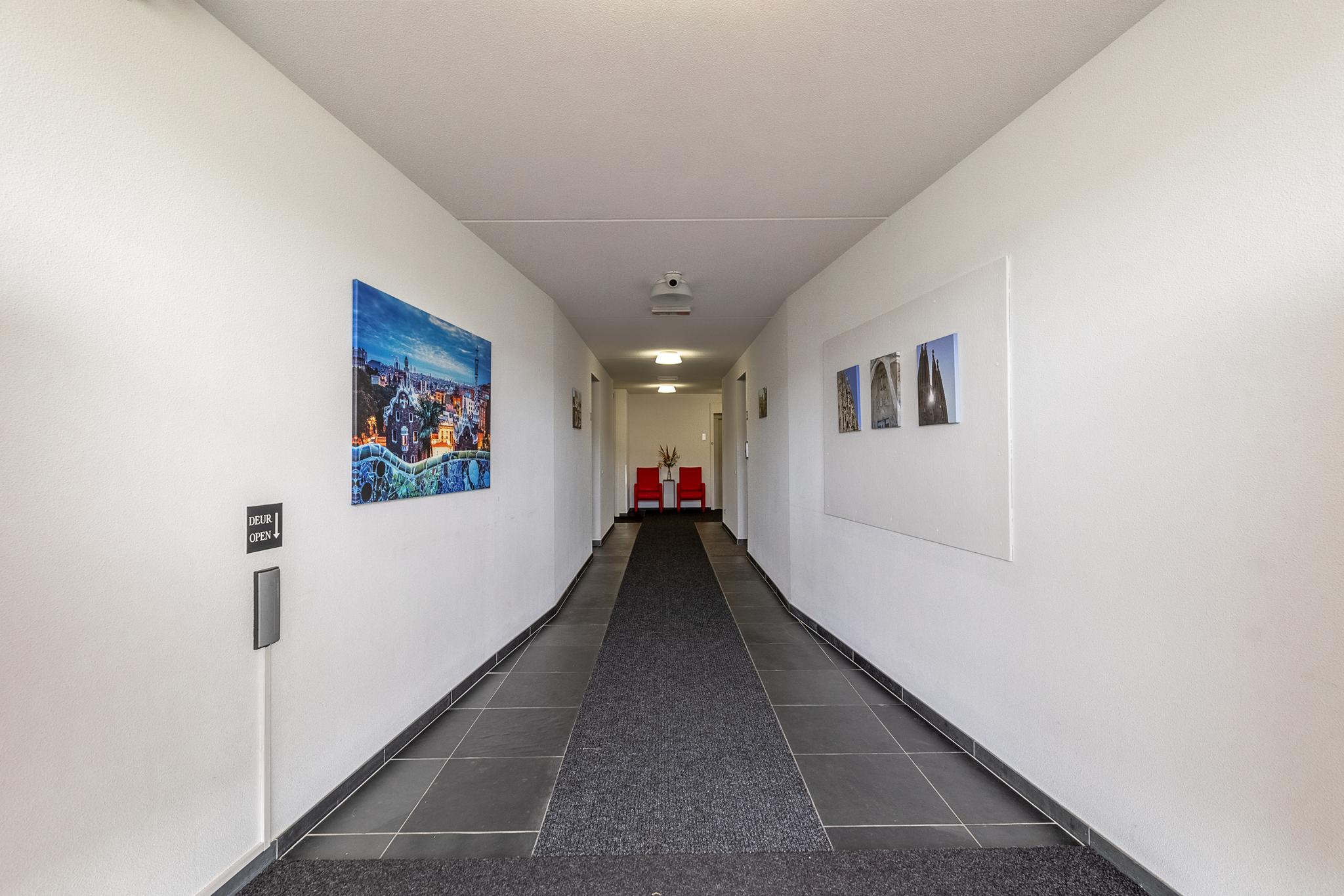 Centrale hal in het gebouw met meterkast. Na de voordeur is er een entreehal. Deze geeft toegang tot de toiletruimte met toilet en fonteintje en de berging. Vervolgens is er toegang tot de lichte living met luxe open keuken. Deze zijn samen ca. 38 m² groot.