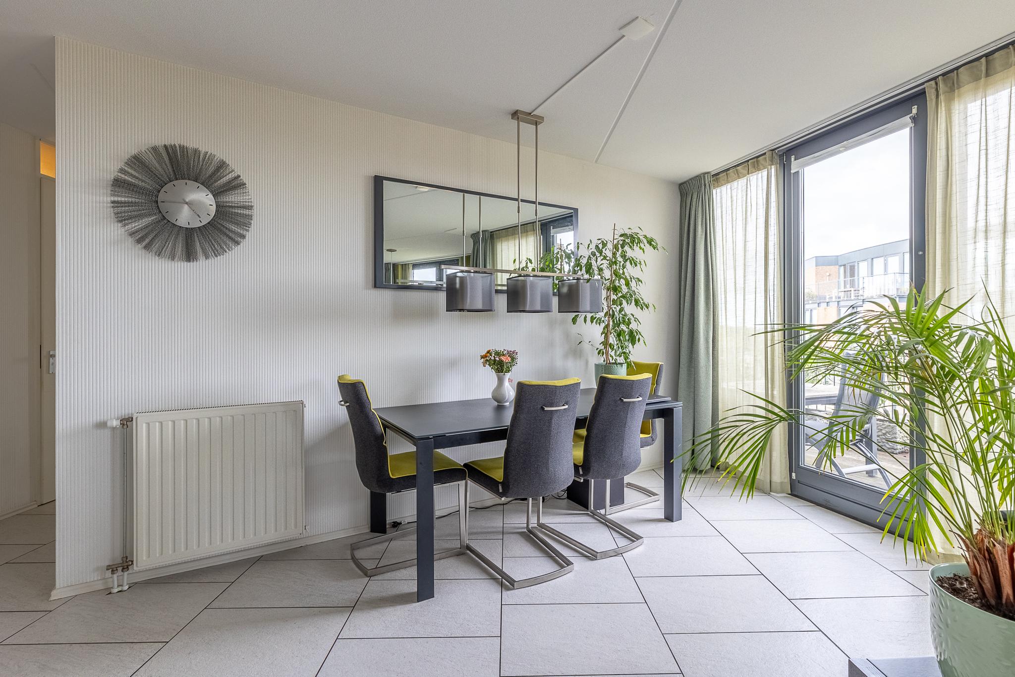 De living is praktisch ingedeeld, heeft een lange wand en loopt breed uit naar de ramen met verspringende gevel. De speelse vorm, de lange wanden en de oppervlakte bieden vele indelingsmogelijkheden. De vloer in de kamer, keuken, portaal en hal is belegd met een keramische tegels. De hoge ramen die van de vloer tot aan het plafond lopen zorgen voor een heerlijke lichtinval.