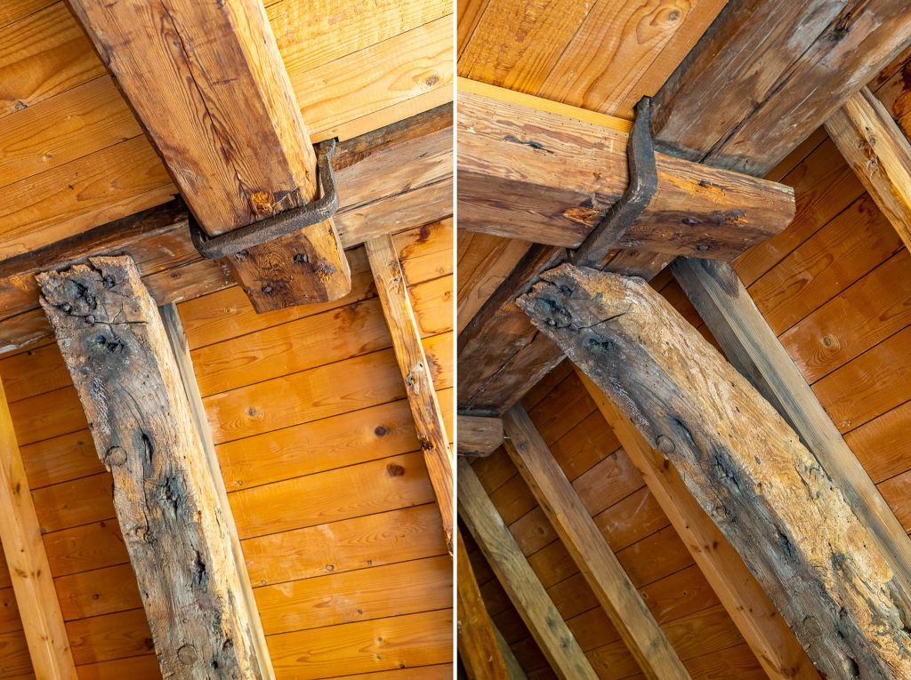 - Oude rondgetrokken scheepsspanten die in de loop der eeuwen hergebruikt zijn als dakspanten