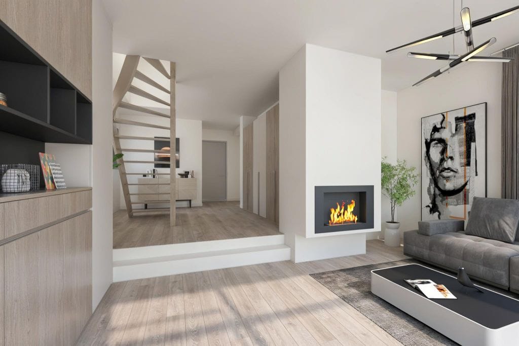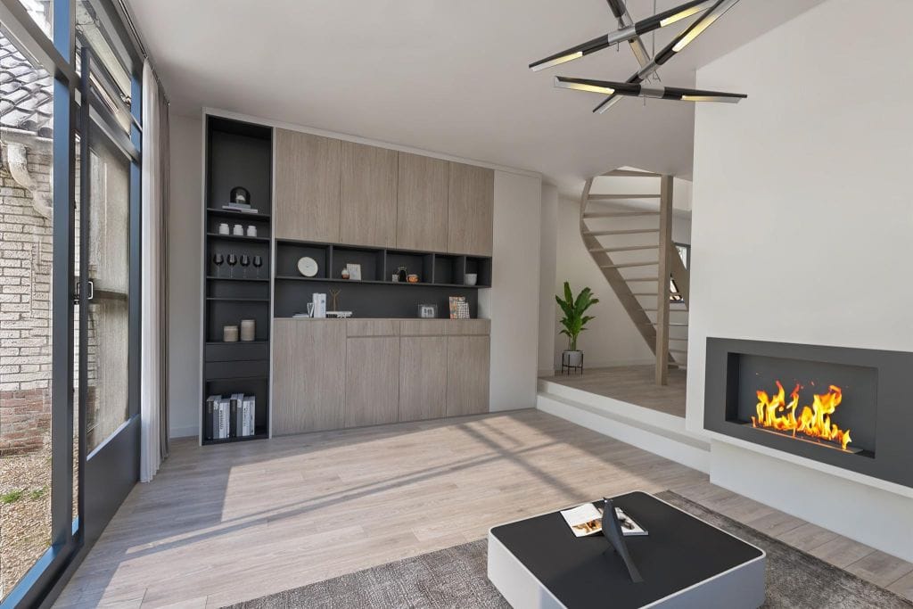 Hal met meterkast en toiletruimte (toilet en fonteintje). Er is een woonkamer die optisch verdeeld is in 3 delen. Aan de straatzijde is de eetkamer, er is een middendeel wat overgaat in een tuingerichte living (met verlaagde vloer). De zitkamer heeft een open haard en een openslaande deur naar de tuin.