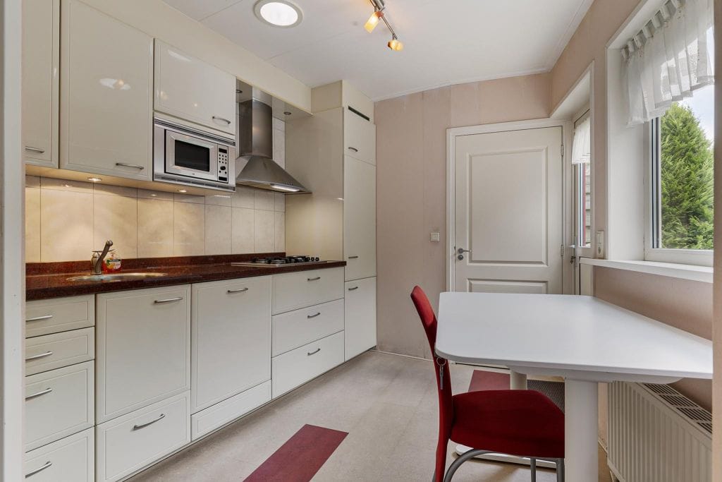 Gang met meterkast. Er is een woonkamer met een hoog balkenplafond, aan de voorzijde zijn 2 symmetrisch geplaatste ramen hetgeen kenmerkend is voor dit type woonhuizen. Aan de achterzijde is een groot raam, de kamer oogt hierdoor bijzonder licht. De betonnen vloer in de woonkamer is belegd met een marmoleum vloer en deze loopt door naar de achtergelegen keuken die zich bevindt in de aanbouw die in 2004 is geplaatst. De aanbouw heeft een taps toelopende vorm. Er is een recht keukenblok, eveneens uit 2004, een granieten blad en aan apparatuur is er een gaskookplaat, afzuigkap, magnetron, koel-vriescombinatie en een defecte vaatwasser. Verder is er een praktische trapkast. Via de keuken kan je naar de achtertuin.