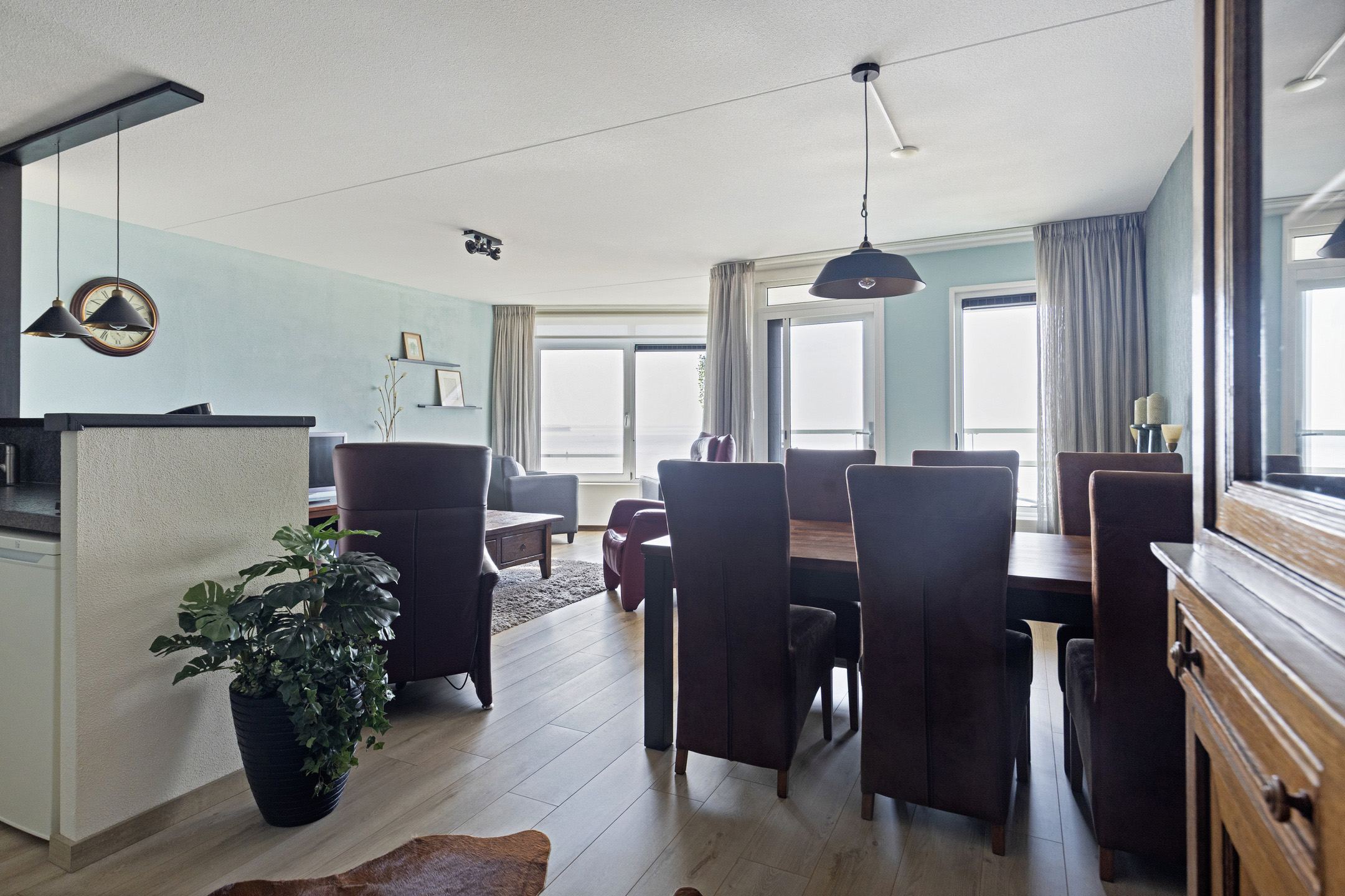 Bij binnenkomst in de centrale hal voelt u direct de verzorgde sfeer van het appartement. Vanuit hier bereikt u de diverse vertrekken, met als absoluut hoogtepunt de royale woonkamer. Wat hier direct opvalt, is de overweldigende lichtinval. De uitgebouwde erker fungeert als een levende schilderijlijst voor het constant veranderende schouwspel op het water. Voor de zonnige dagen biedt de elektrische zonwering uitkomst, terwijl de stijlvolle radiatorombouw de kamer een strakke, afgewerkte uitstraling geeft. Grenzend aan de woonkamer vindt u het zonnige balkon op het zuidwesten, dat sfeervol is afgewerkt met lambrisering; de perfecte plek om met een drankje de zon in de zee te zien zakken.