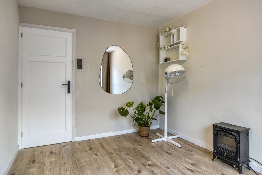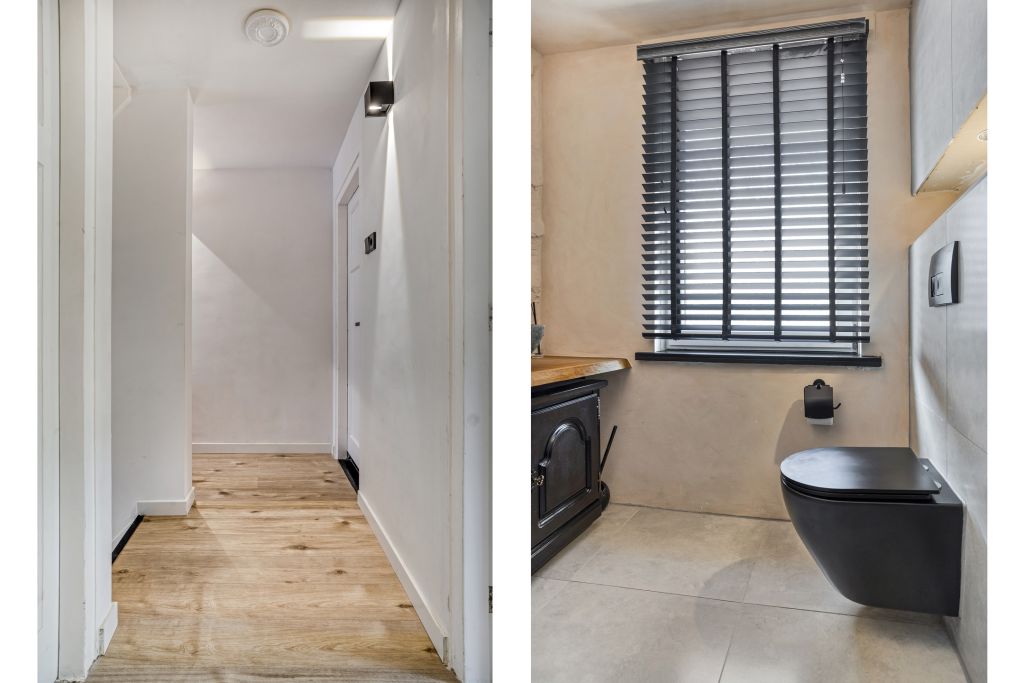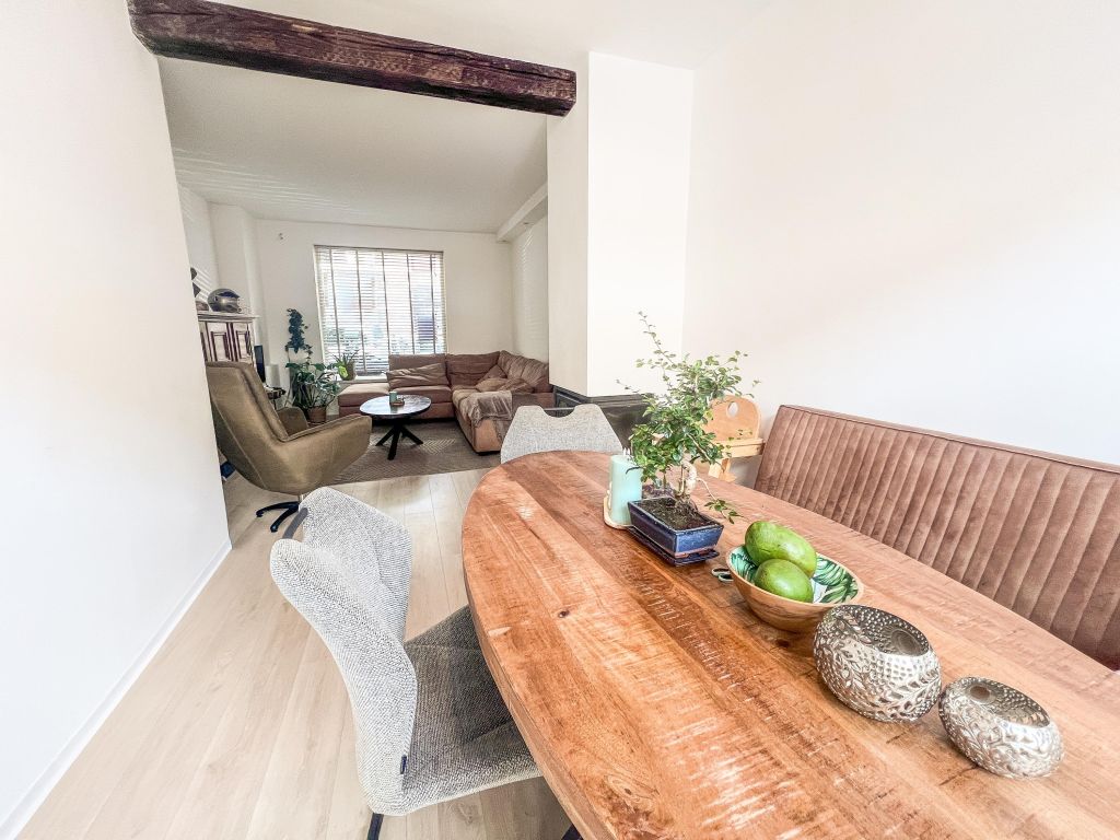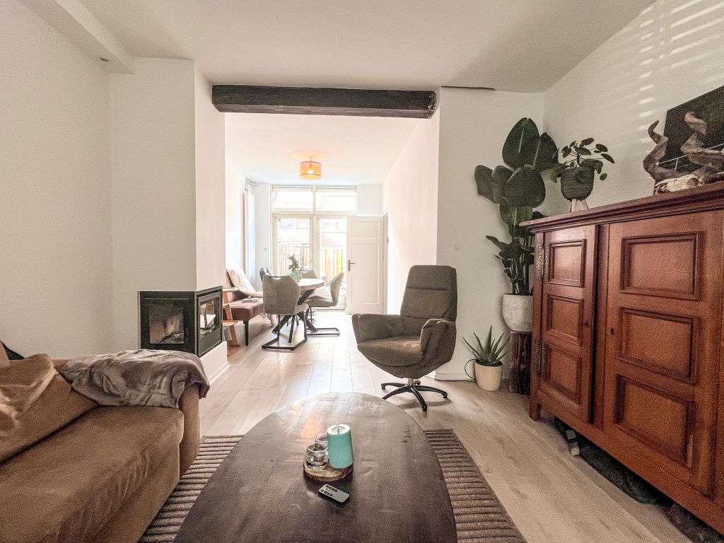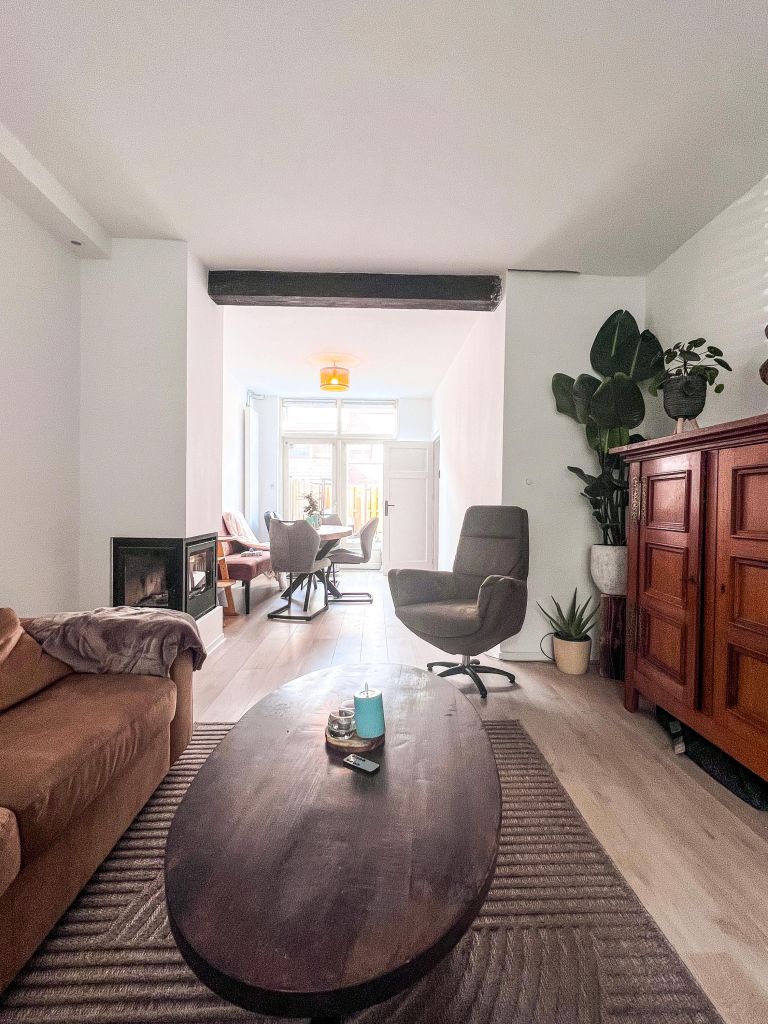Zodra je de woning betreedt, word je verrast door de frisse uitstraling van de recent gestucte wanden in helder wit. De vloer in de hal en woonkamer is afgewerkt met een licht laminaat in houtmotief, wat direct zorgt voor warmte en een eigentijdse uitstraling. In de ruime living is het heerlijk vertoeven. De kamer is prettig indeelbaar, biedt ruimte voor zowel een grote zithoek als een royale eethoek, en wordt verlevendigd door een sfeervolle haardpartij en moderne ingebouwde plafondverlichting. Een bijzonder accent is de massief houten balk die in het zicht is gebleven en op subtiele wijze herinnert aan het bouwjaar van de woning. Openslaande deuren naar de achtertuin zorgen voor een fijne verbinding tussen binnen en buiten, en geven de woonkamer een vriendelijk en open karakter.