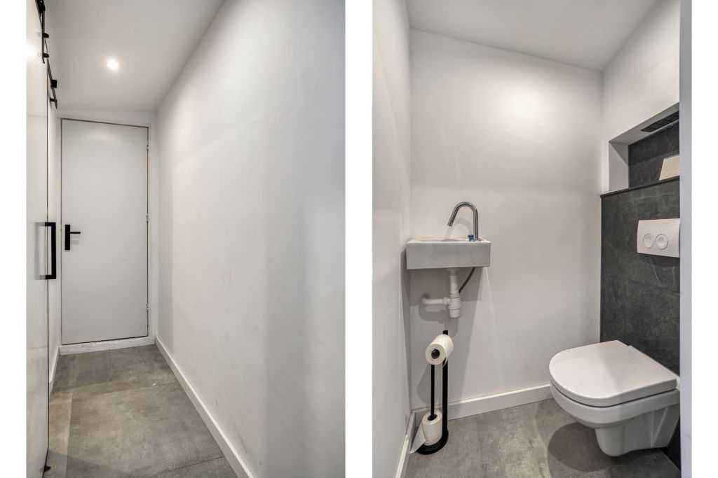 Achter de keuken ligt een hal waar je onder meer een praktische kast vindt voor de wasmachine en voorraad, en een strak afgewerkte toiletruimte met hangtoilet en fonteintje. Tot slot is er een royale berging aanwezig, ideaal voor het opbergen van fietsen, gereedschap of grotere spullen die je graag uit het zicht bewaart.