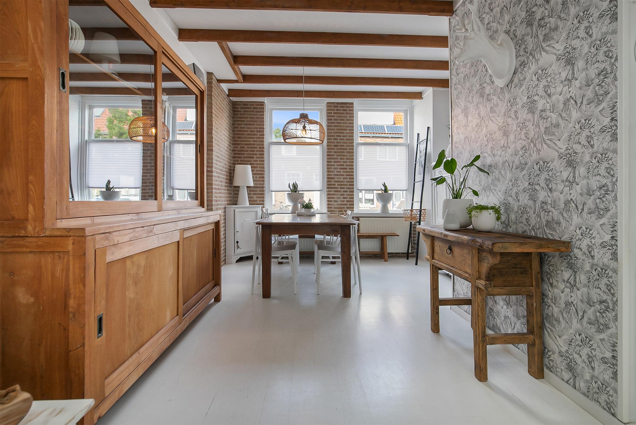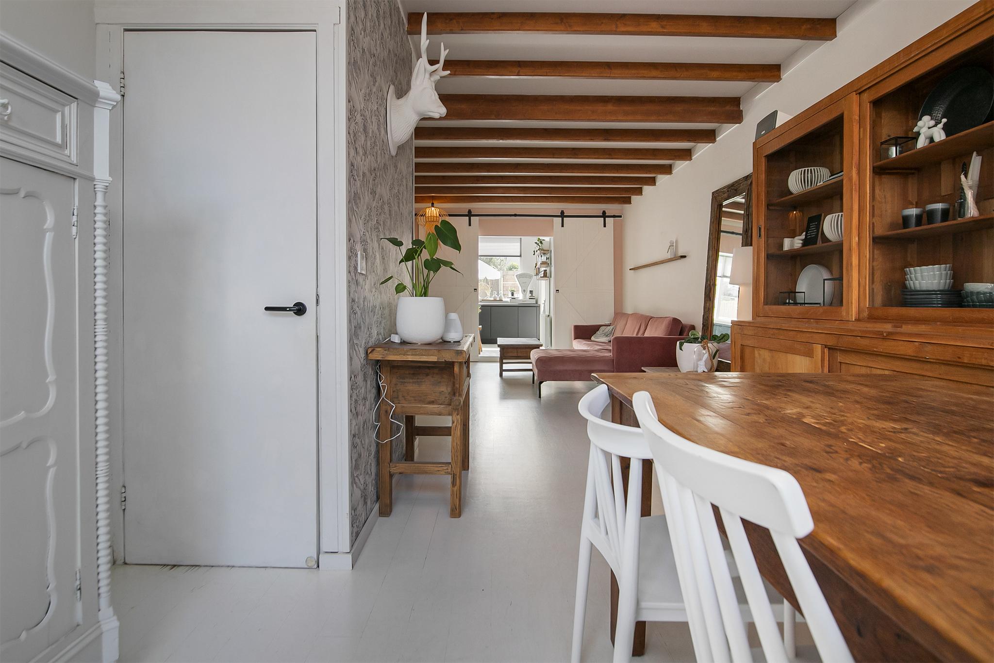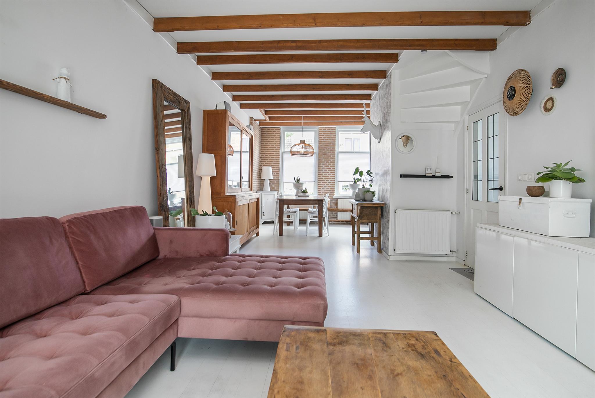 De jaren ’30-woning heeft een heerlijke, warme sfeer, is naar achter toe uitgebouwd met een riante keuken en modern toilet en heeft een grote woonkamer. De balkenplafonds, de houten barndeuren (deuren met een katrol op een rail) naar de keuken en de wit geschilderde eiken vloerdelen vormen een mooi decor voor uw meubelen.
