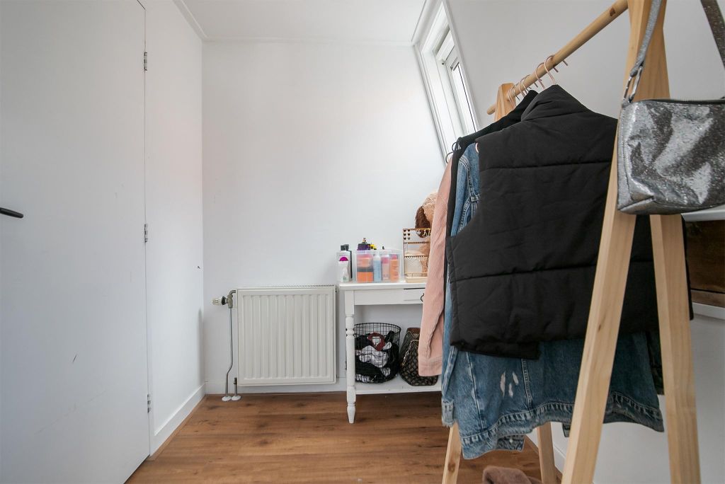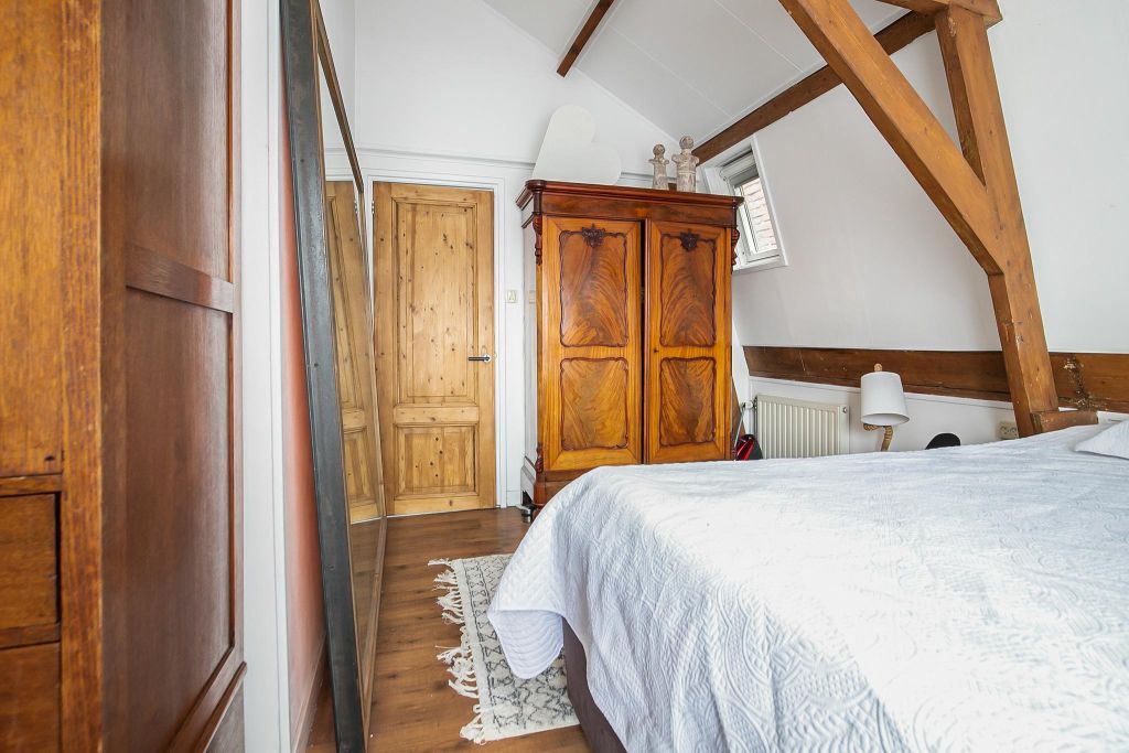 Via een portaal vanuit de woonkamer neem je de trap naar de verdieping. Aan de voorzijde is een slaapkamer en een heel complete, ruime badkamer met een ligbad (hoekmodel), een toilet, een wastafel in een badmeubel, een inloopdouche en een handdoekenradiator. Ook de badkamer heeft de frisse kleur wit als basiskleur. Vanuit de overloop is vervolgens een 2e slaapkamer (middendeel van de woning) en een heel royale 3e slapkamer te bereiken. De slaapkamers hebben mooi in het zicht gehouden oude spantconstructies. En als je lekker van de zon wilt genieten kan je via de grootste slaapkamer naar het dakterras. Tot slot is er nog een zolderberging.