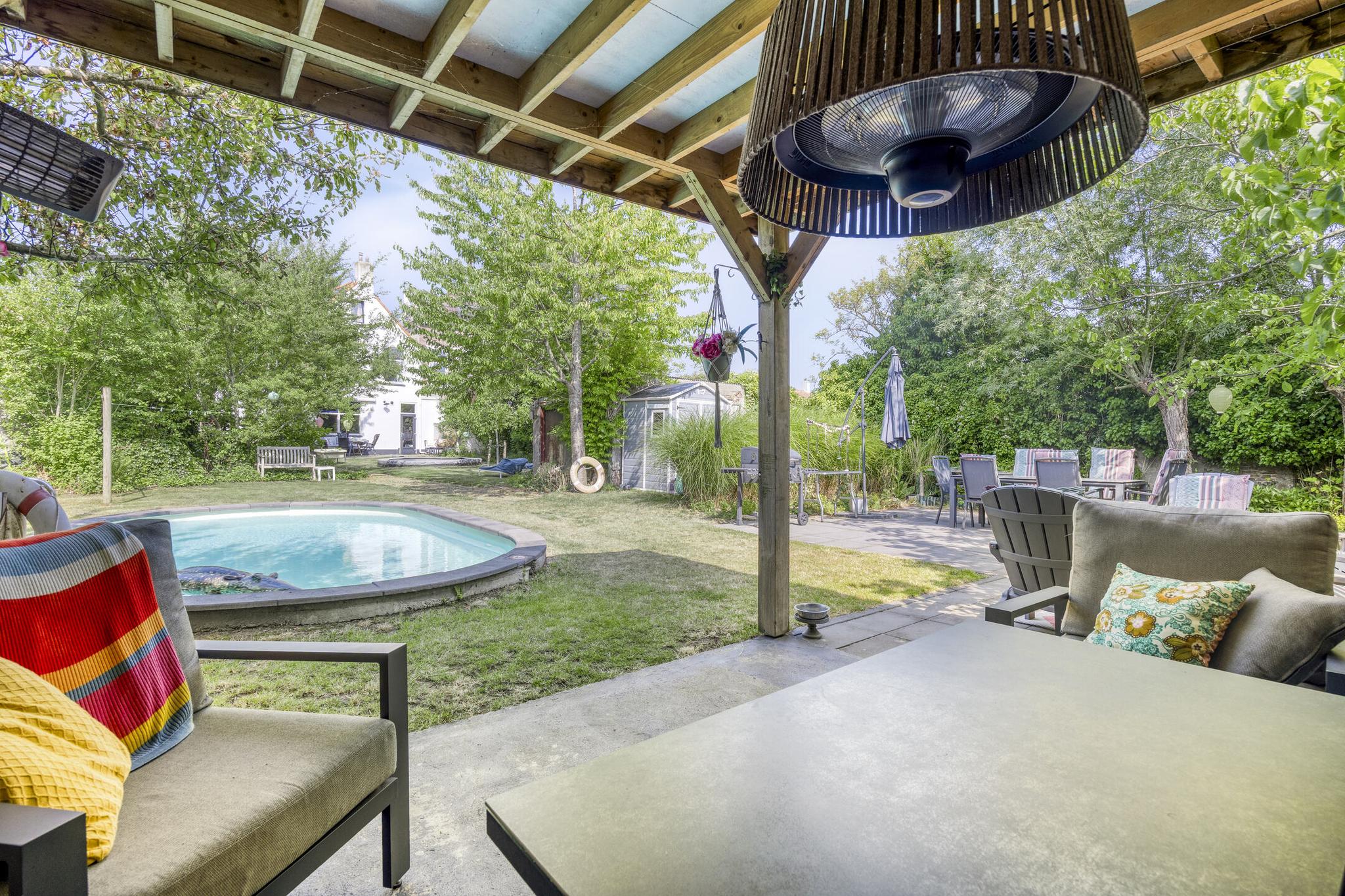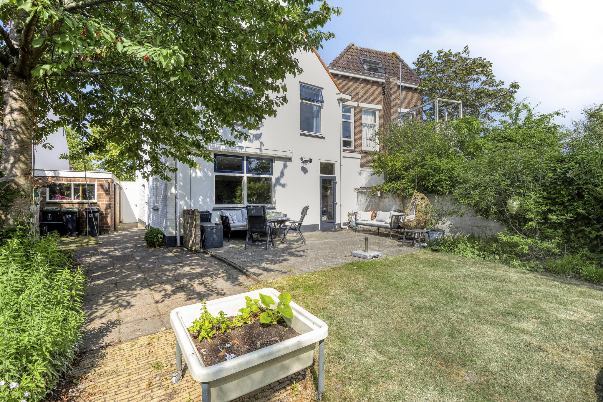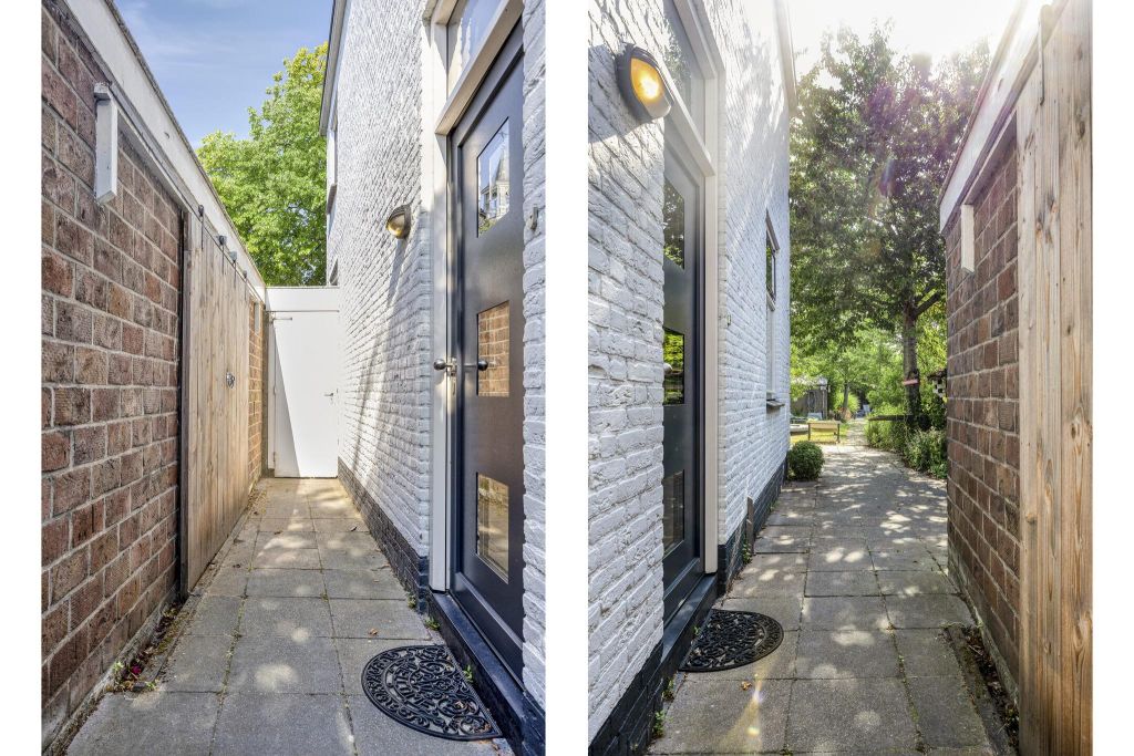 Achter de gevel ontvouwt zich een verrassend ruime en besloten wereld. Via een poort naast de woning betreed je de tuin, die ook vanuit de woning bereikbaar is. Eenmaal binnen de grenzen van het perceel waan je je in een groene oase, een parkachtige tuin waar rust en privacy vanzelfsprekend zijn. Midden in het gazon ligt een zwembad (2022) dat op zomerse dagen zorgt voor verkoeling en plezier. Achter in de tuin staat een stijlvol ingericht tuinhuis met veranda, ideaal als thuiswerkplek, atelier of ruimte voor ontspanning. Een voormalige kleinveestal doet nu dienst als berging. Oude elementen zoals een tuinpoort, een kelder die uitnodigt tot restauratie en diverse terrassen geven deze tuin charme, karakter en functionaliteit. Overal vind je wel een plek in de zon of juist de schaduw, omringd door hagen, bomen en struiken die het geheel tot een levend schilderij maken.