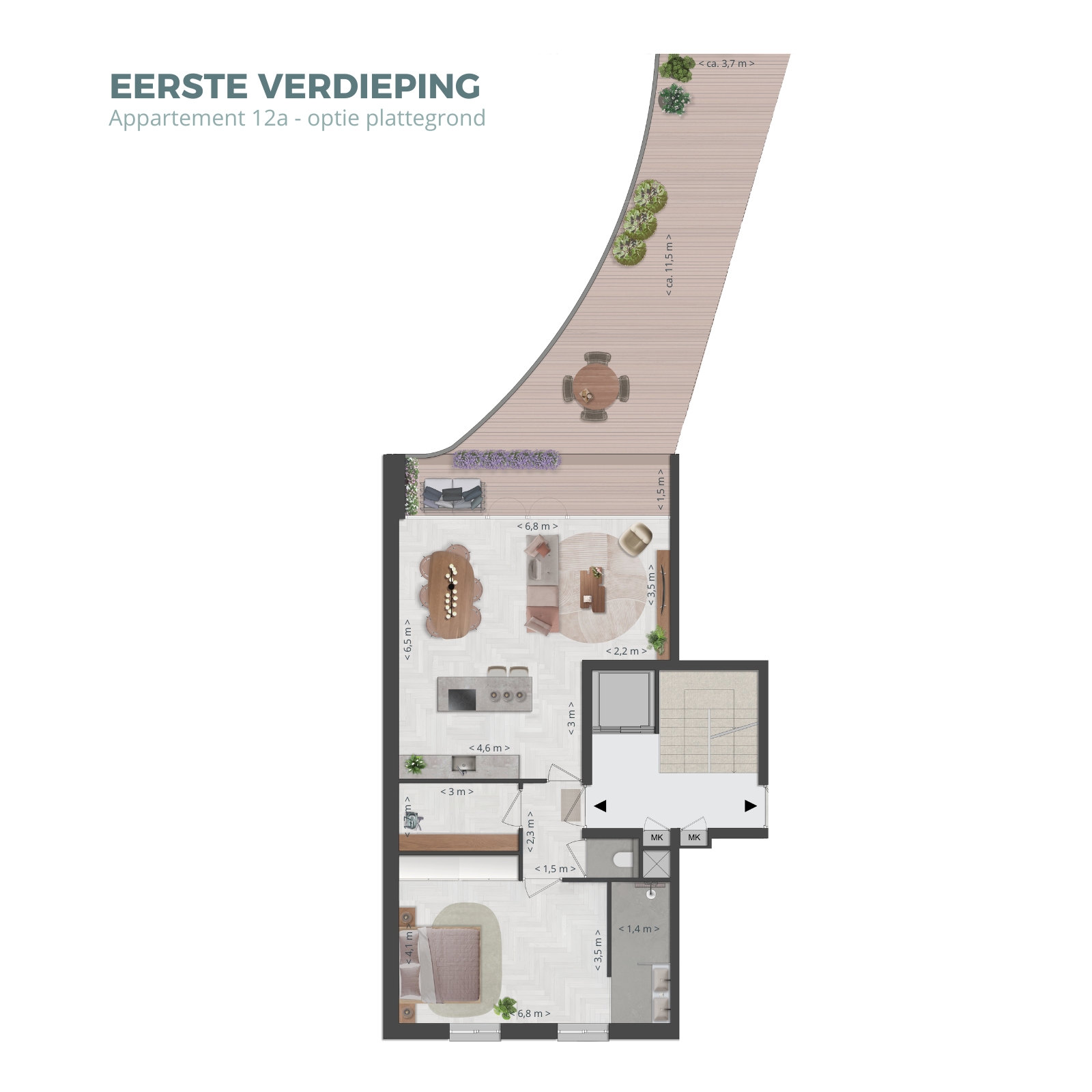 Elk appartement beschikt over één of twee slaapkamers, een ruime badkamer en berging met opstelplaats voor wasmachine, droger en de technische installatie.