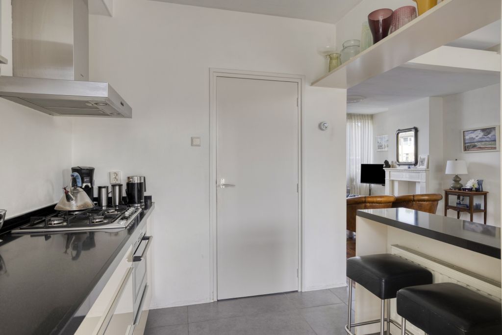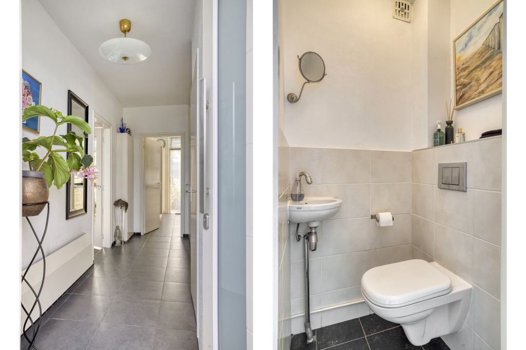De keuken is netjes en modern met een frisse uitstraling. Je vindt er alle nodige apparatuur zoals een kookplaat, oven, afzuigkap, vaatwasser en koelkast, samen met voldoende bergruimte. Het is een fijne plek om te koken en tegelijk in contact te blijven met wat er in de woonkamer gebeurt. Op de begane grond is er verder een handige trapkast, een verzorgd toilet met fonteintje en een meterkast met de basisvoorzieningen. Ook is er een glasvezelaansluiting aanwezig.