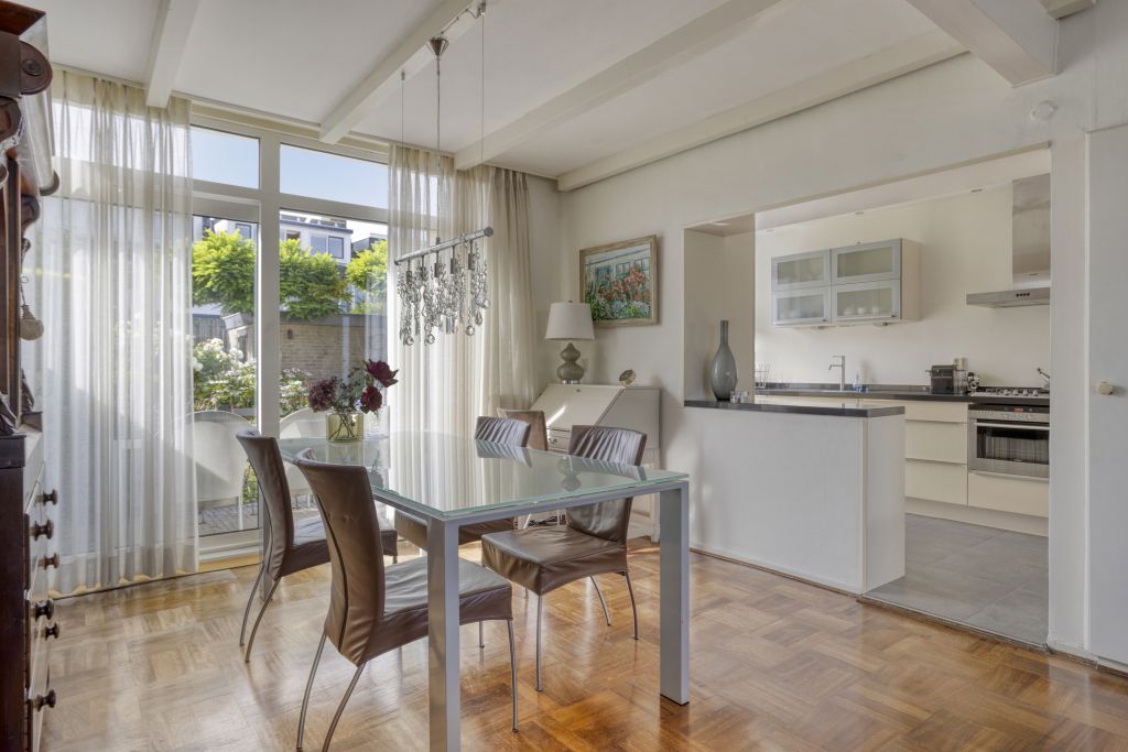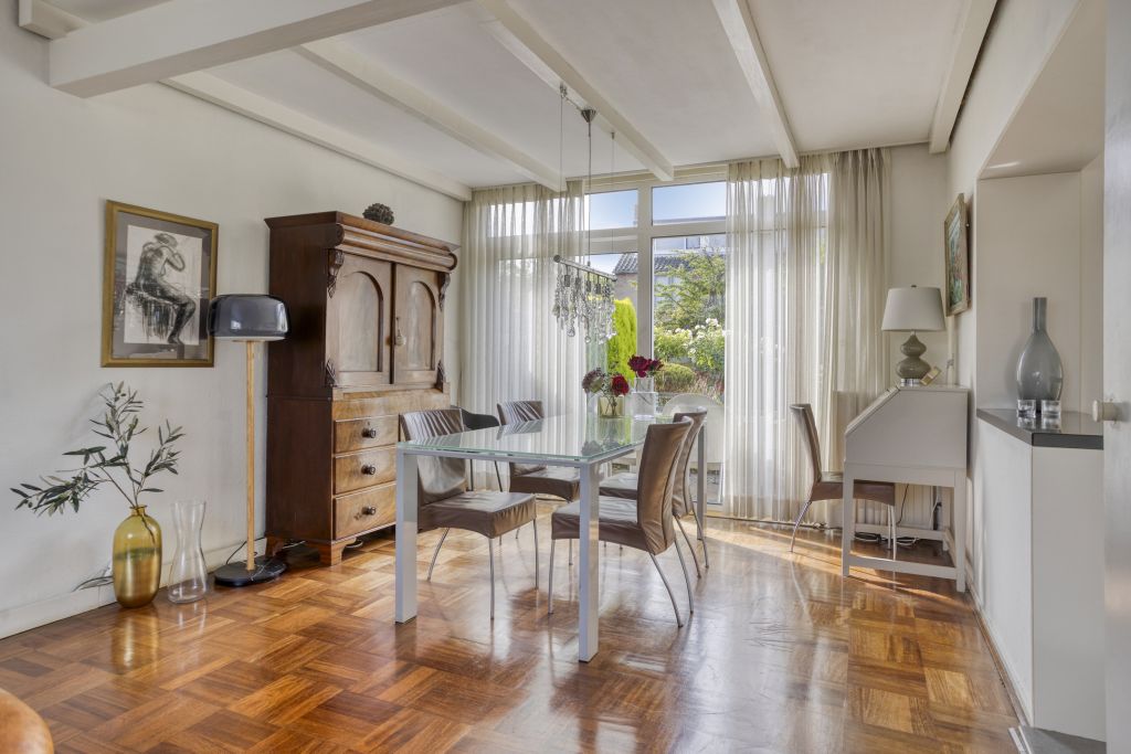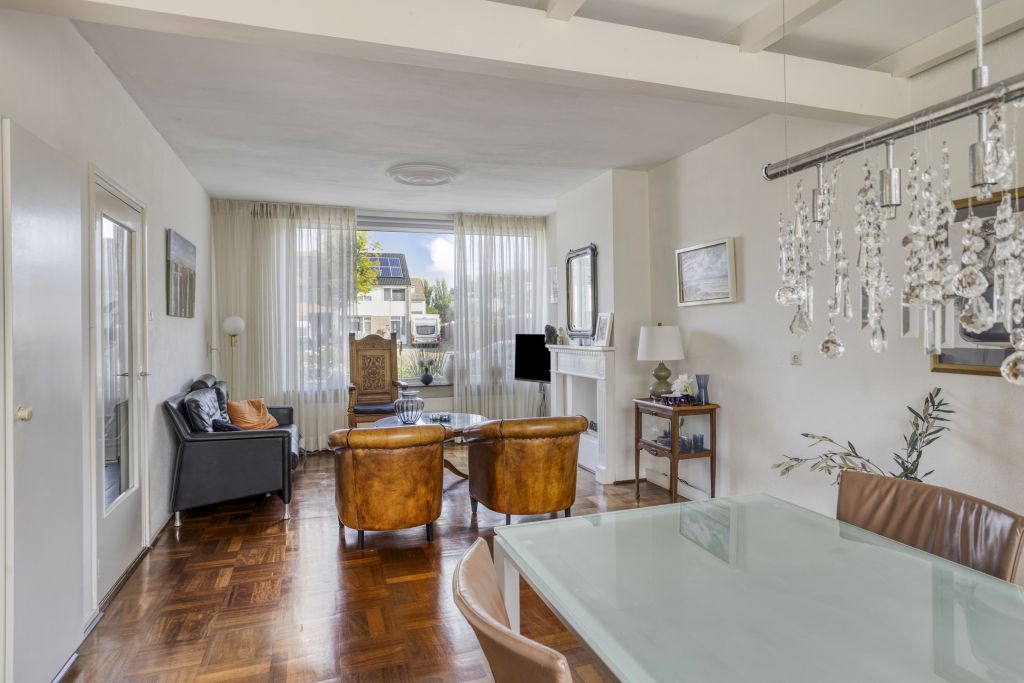 De woning zelf is jarenlang met zorg bewoond geweest door één familie en dat merk je aan alles. Goed onderhouden en in de loop van de tijd op verschillende punten gemoderniseerd. Binnen is de woonkamer opvallend ruimtelijk. De muur tussen de keuken en de kamer is al eerder verwijderd, waardoor er een open en lichte leefruimte is ontstaan. De houten mozaïekvloer geeft karakter en de witte wanden maken het geheel licht en fris. Grote ramen zorgen voor een prachtige lichtinval gedurende de hele dag.