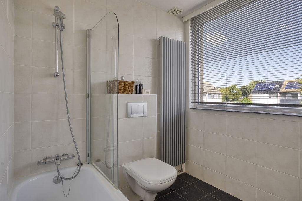 Op de eerste verdieping zijn drie slaapkamers, allemaal van goed formaat. De slaapkamer aan de voorzijde is voorzien van een vaste kastenwand, gemaakt door de vorige bewoner. De kamers aan de achterzijde kijken uit op het groen van de achtertuin. De badkamer is compleet en functioneel, met een ligbad waarin ook een douche zit met een glazen scherm, een wastafelmeubel en een tweede toilet.