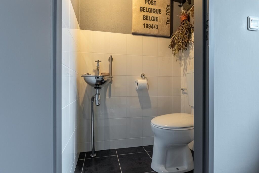 Hal (via deur in de zijgevel). De kleurstelling binnen die kenmerkend is voor deze woning laat zich hier al zien met antracietkleuren deuren, deurstijlen, grijze wanden en een houten vloer. In de hal bevindt zich ook de meterkast (met een veelvoud aan groepen) en een toiletruimte met toilet en fonteintje (RVS).