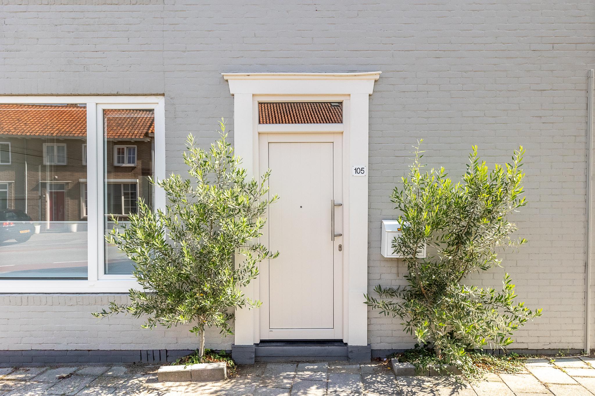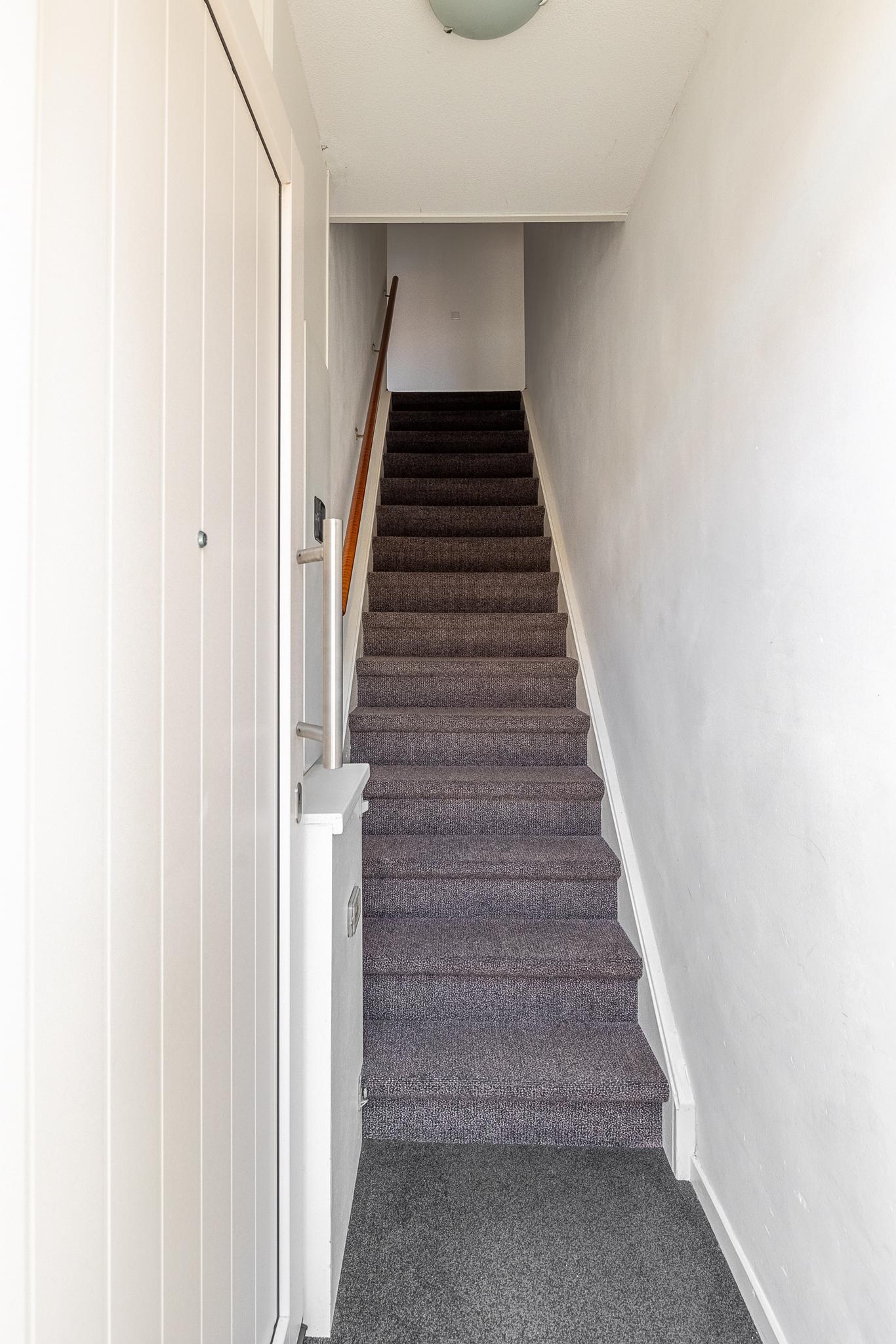 In de grijs geschilderde gevel is aan de Gravestraat de entree met een kunststof deur (2022). Hier is een meterkast (5 groepen en aardlekschakelaar) en een rechte trap naar de verdieping.