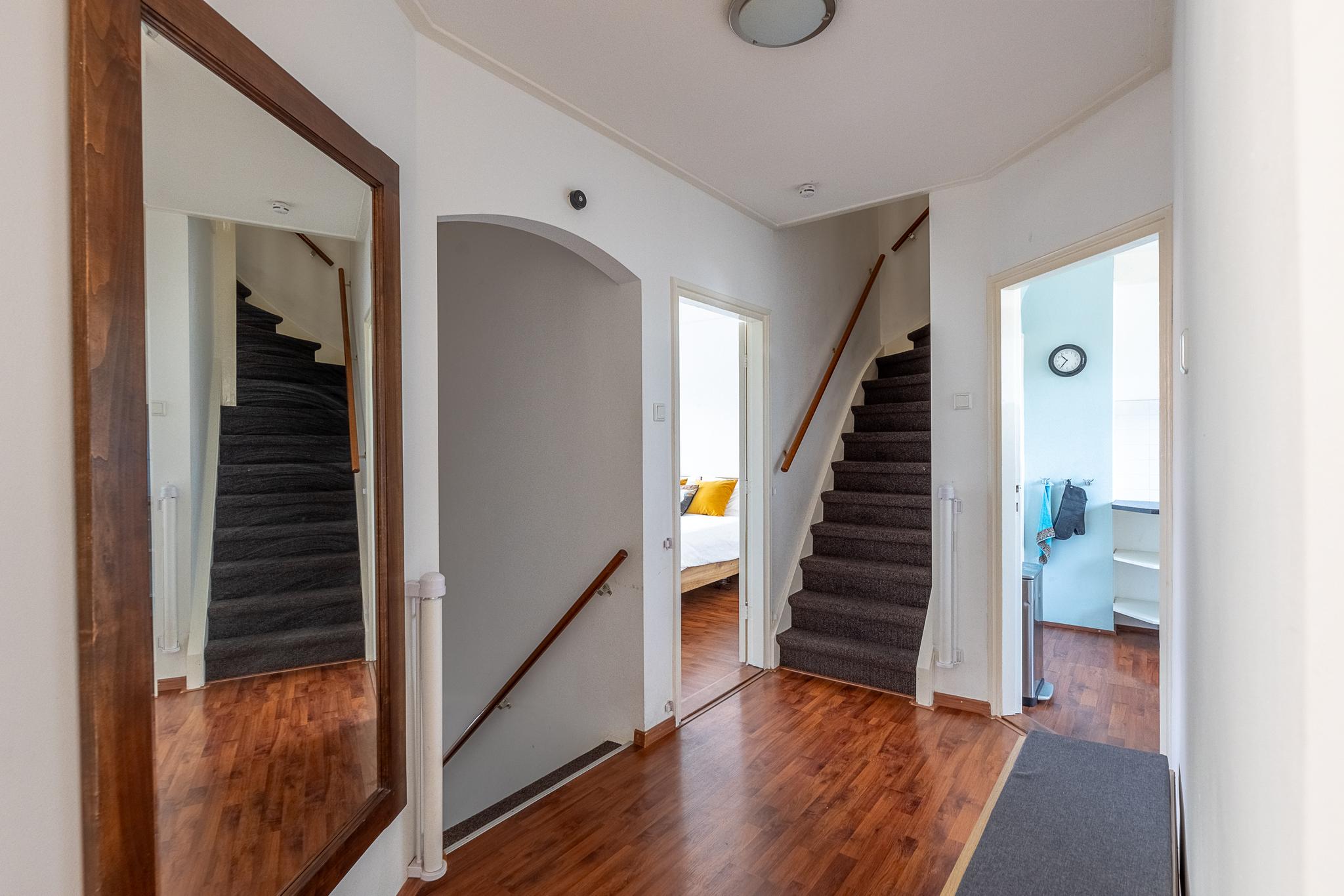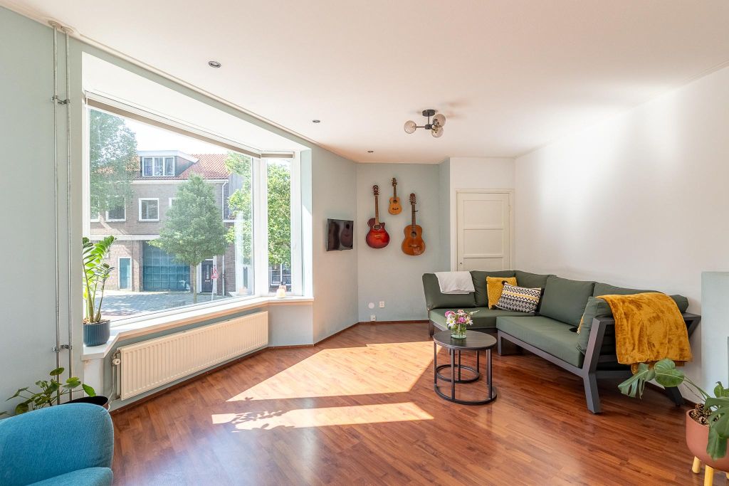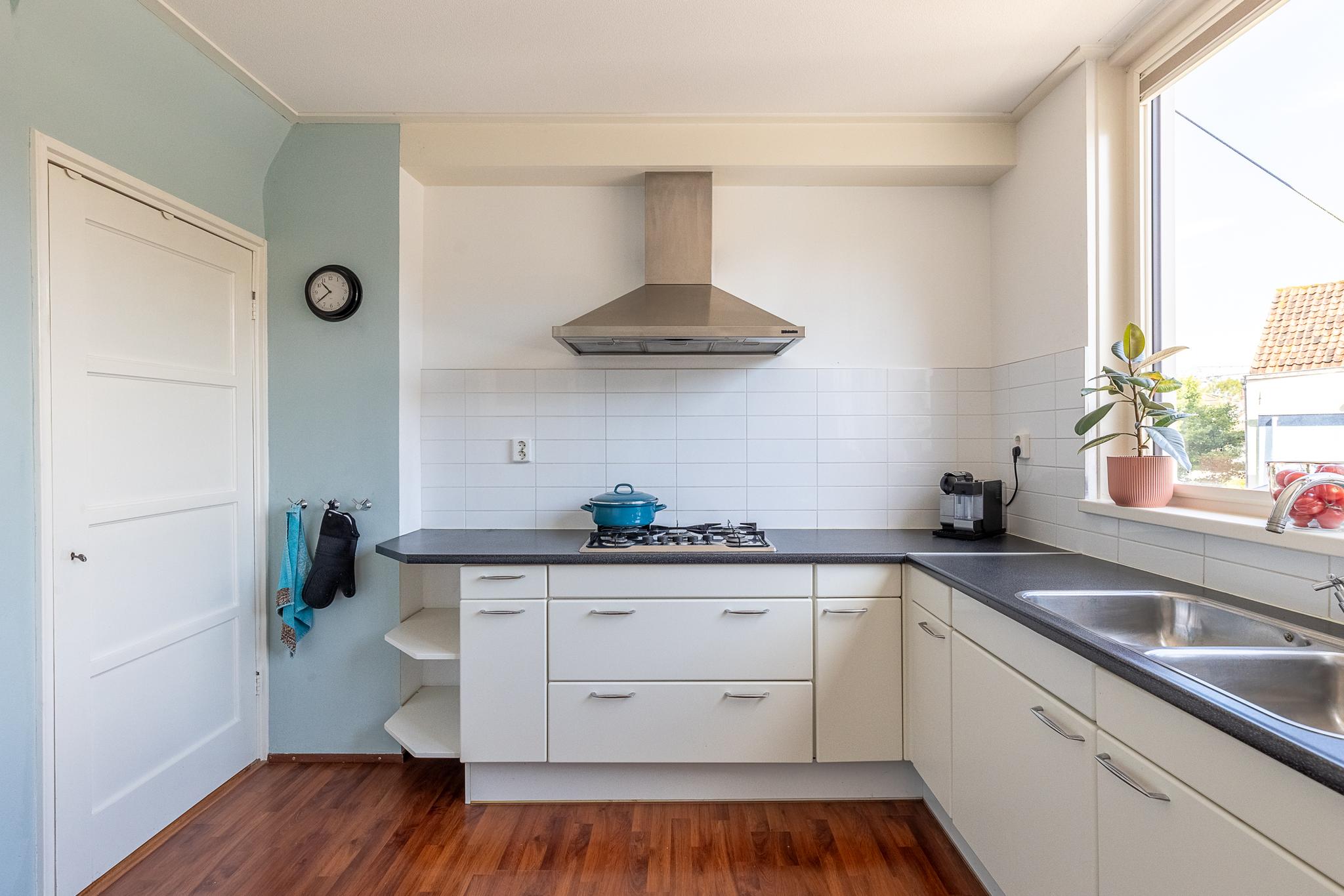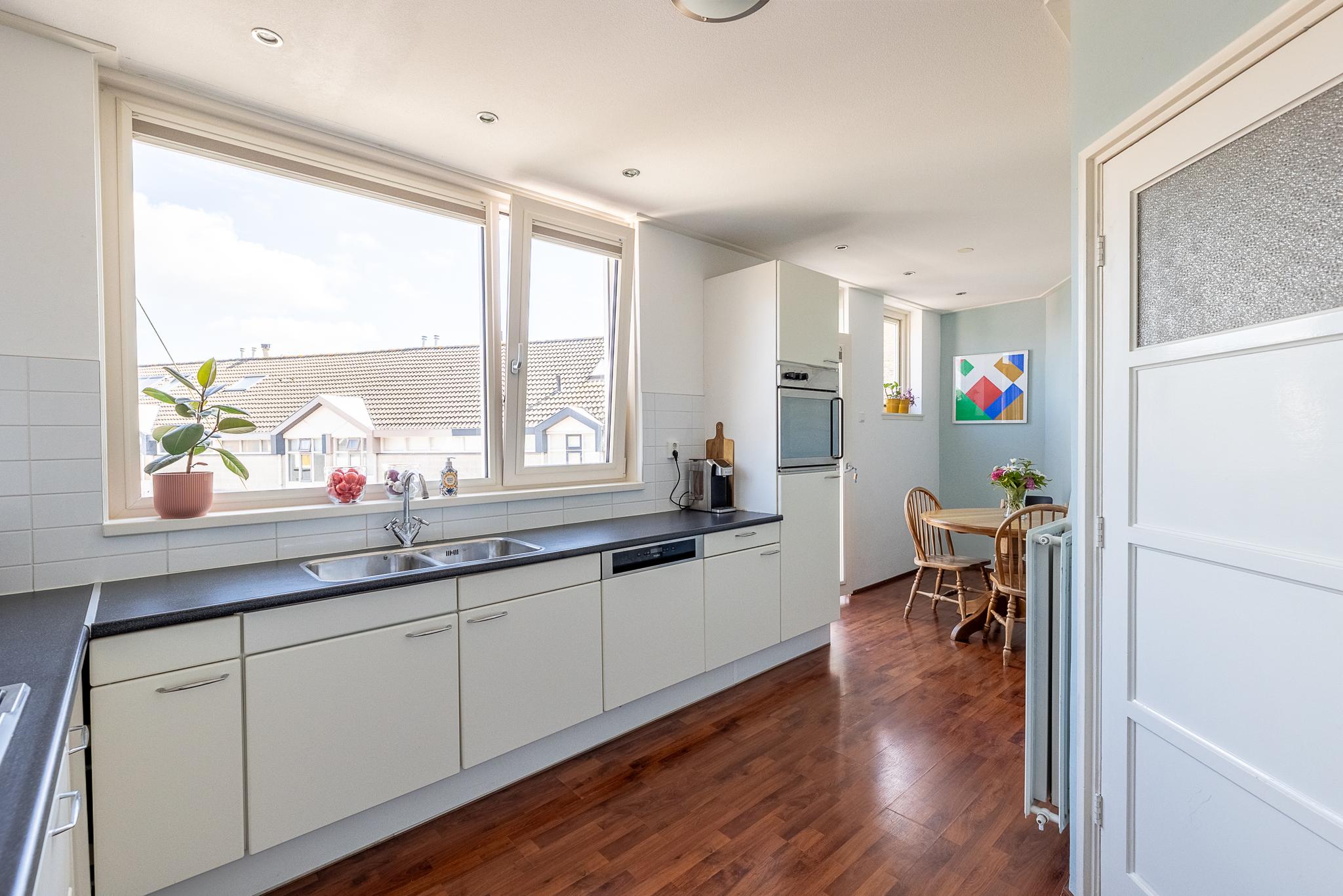 Een centraal gelegen overloop met lichte wanden en een laminaatvloer is het vertrekpunt naar alle ruimtes. De woonkamer ligt echt op de kop van het gebouw wat extra geaccentueerd wordt door de erker met de grote raampartij (kunststof uit 2019) waarvandaan je een fantastisch zicht hebt op het buitengebeuren. De grote ramen zorgen voor veel lichtinval en dat maakt dat alles nog vriendelijker oogt. Overigens zijn bijna alle andere kozijnen in 2022 vernieuwd en voorzien van HR++ beglazing. Let ook op de binnendeuren, de paneeldeuren horen echt in een woning van deze tijd en passen naadloos in de strak gestucte muren. Er is een royale keuken. De keuken, eveneens met een markante vorm, biedt plaats aan een groot L-vormig keukenblok met onder meer aan apparatuur een gaskookplaat, een afzuigkap, vaatwasser, (2021) koelkast en oven. Een praktische bergkast met de eerder genoemde paneeldeur biedt extra opbergruimte. Ook hier zorgen de grote ramen voor aangenaam lichtinval. De grootte van de keuken stelt je in staat om ook een eethoek te plaatsen.