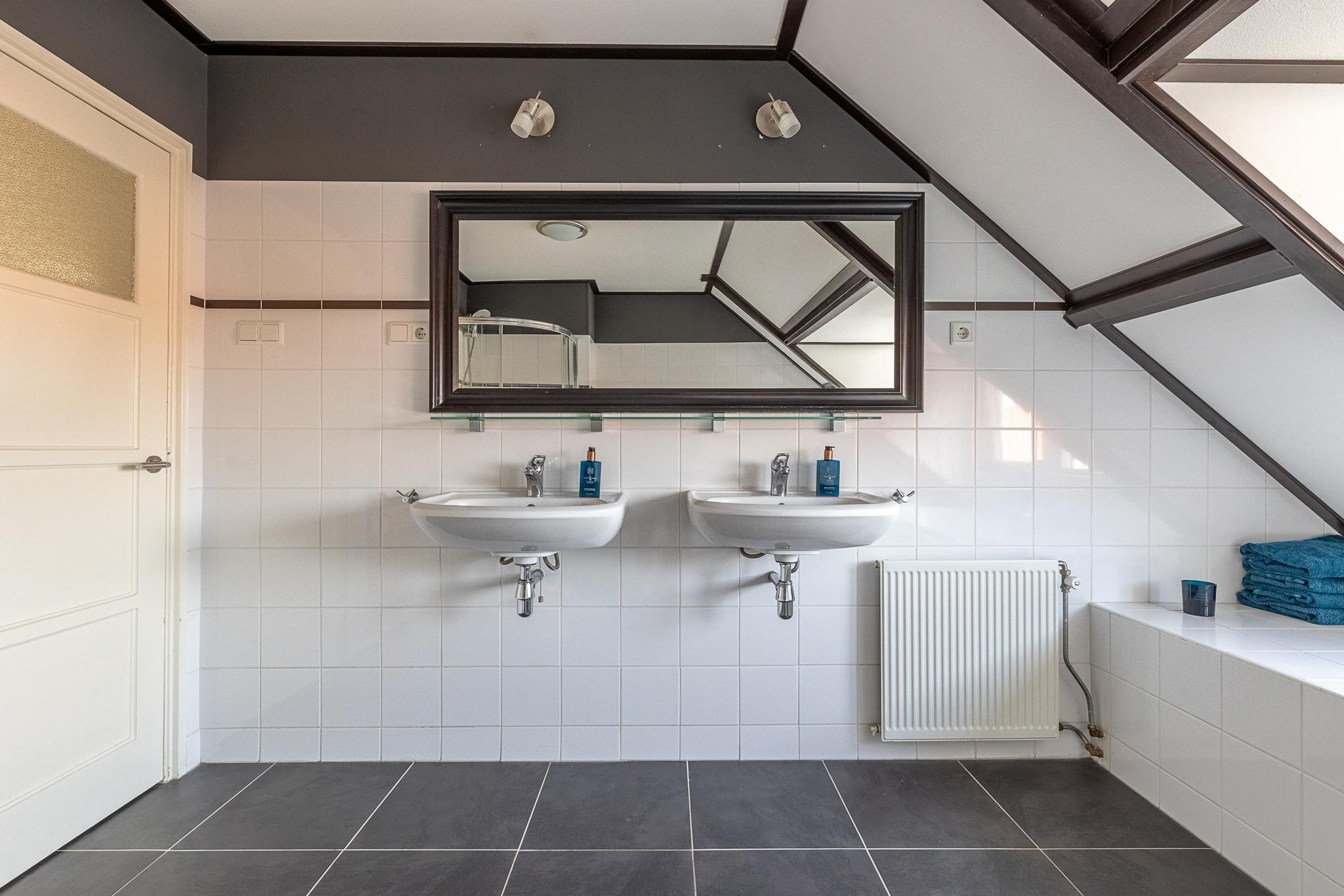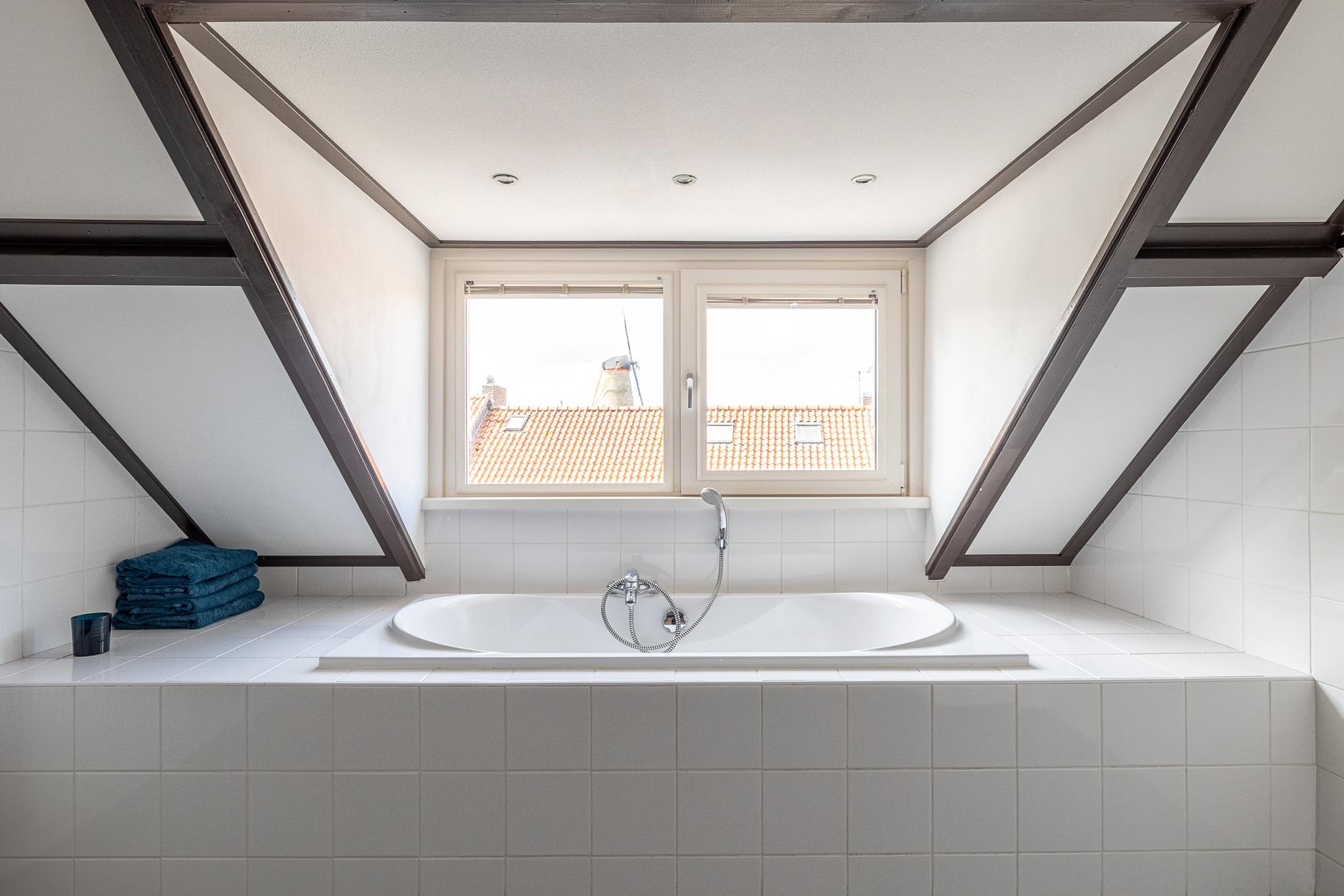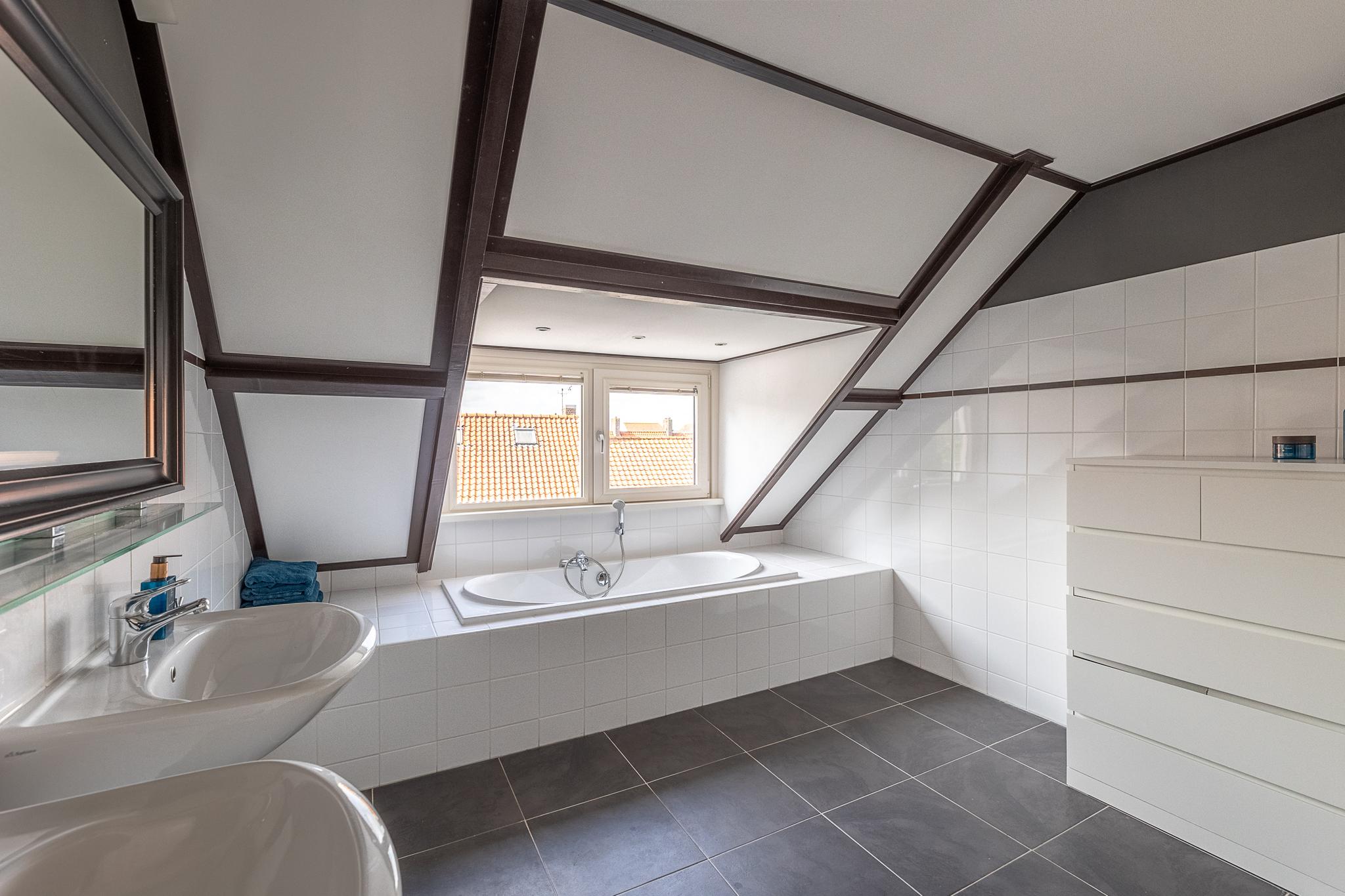 De centraal gelegen overloop heeft 5 deuren. Eén deur leidt naar de 2e toiletruimte met toilet. 2 Deuren leiden naar 2 ruime slaapkamers waar ook de vorm van het gebouw weer de contouren van de kamers markeert. Eén deur leidt naar de 4e (kleinere) slaapkamer en de laatste deur brengt je naar de grote badkamer met ligbad (onder de dakkapel), 2 wastafels een separate douche en handdoekenradiator. De badkamer heeft antracietkleurige vloertegels en witte wandtegels. De ruimte zal je aangenaam verrassen. Op deze verdieping is ook de c.v.-combi-ketel van het merk Nefit uit 2023. De woning heeft nog een flinke zolderberging die via een vlizotrap te bereiken is.