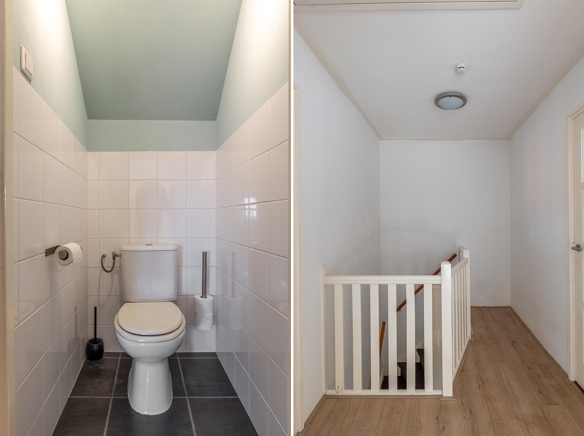 Op deze verdieping is er nog een 2e kamer. Voor de één is dit een eetkamer, voor de ander een ruime slaapkamer met vaste kastruimte en aansluitende ruimte met opstelling voor wasmachine en droger. Deze diverse invullings-varianten maken deze bovenwoning ook tot een aantrekkelijke, complete woning. Voor dat we nog een verdieping hoger gaan, benoemen we nog de toiletruimte met toilet en fonteintje.