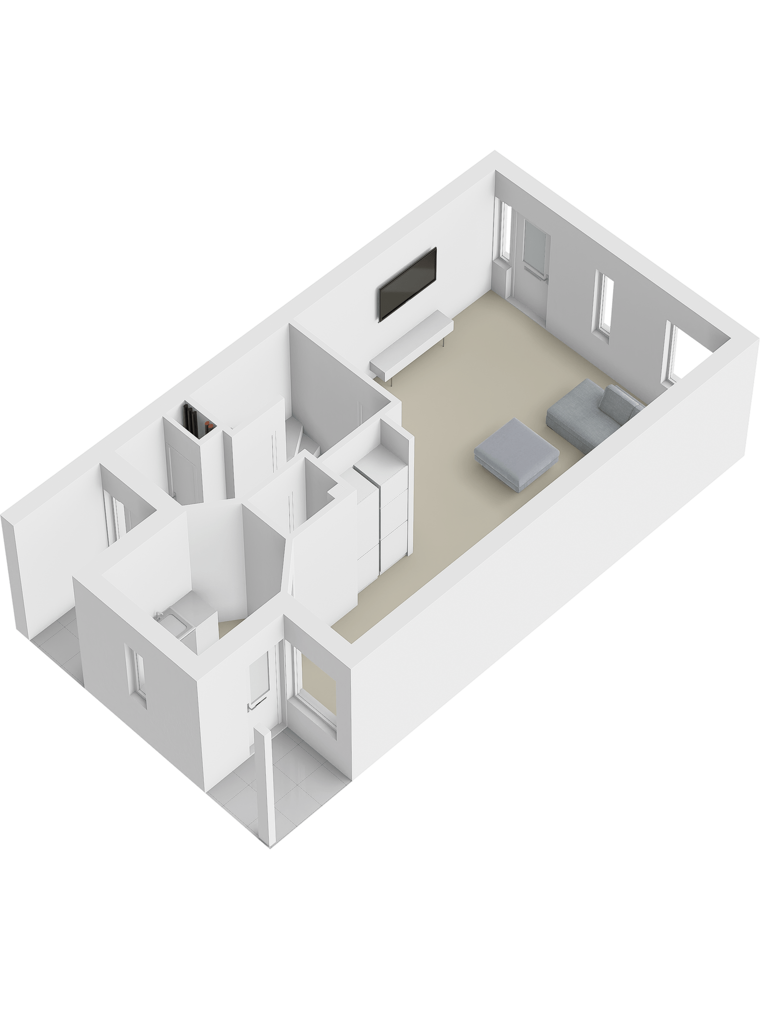 De hal bestaat uit een voorportaal en een hal met toegang tot de toiletruimte (toilet met fonteintje), meterkast (voorzien van 6 groepen met automatische zekeringen, slimme meters en aardlekschakelaars. (De PV-panelen zijn middels een switch aangesloten op de groep van de wasmachine).