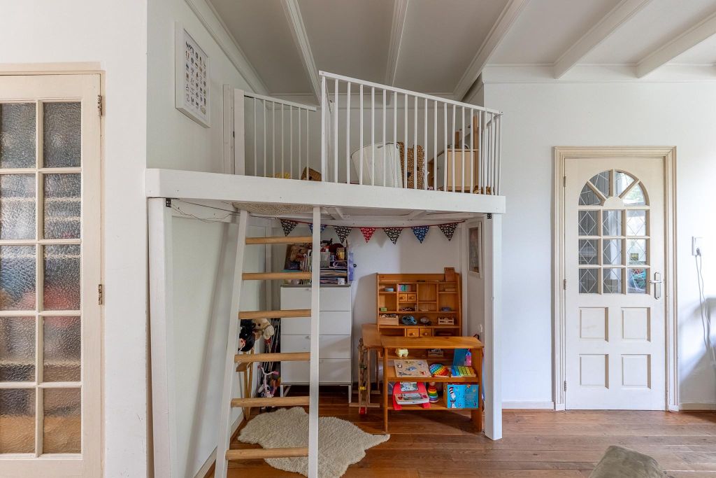 Bij het betreden van de hal, waar de meterkast en garderobe zich bevinden, krijg je meteen een indruk van de sfeer in de woning - warm en sfeervol. De woonkamer is voorzien van een prachtige parketvloer, een authentiek balkenplafond en een gezellige schouw met een houtkachel. Deze lichte ruimte heeft een zithoek aan de voorzijde en een open keuken met eethoek aan de tuinzijde. In de hoek van de woonkamer is een verhoogde speelhoek gecreëerd, ideaal voor kinderen om te spelen, hutten te bouwen en te klauteren. Als je geen behoefte hebt aan een speelhoek, is deze eenvoudig te demonteren. In het smallere deel van de woonkamer vind je een handige trapkast. De lichte keukenopstelling met een donker natuurstenen blad loopt over de volledige breedte van de achtergevel. Terwijl je kookt, bieden twee grote ramen een prachtig uitzicht op de tuin. De keuken straalt een landelijke sfeer uit en is uitgerust met diverse inbouwapparatuur en een vaste kast voor extra bergruimte. Het plafond in de keuken, met sierlijsten en ornamenten, zorgt voor een authentieke sfeer. Vanuit de keuken kom je in de gang met de trapopgang en toegang tot de bijkeuken. Hier vind je de aansluitingen voor de wasmachine en droger. Verschillende kamers zijn voorzien van fraai tegelwerk met een authentieke uitstraling die perfect bij het karakter van de woning past.