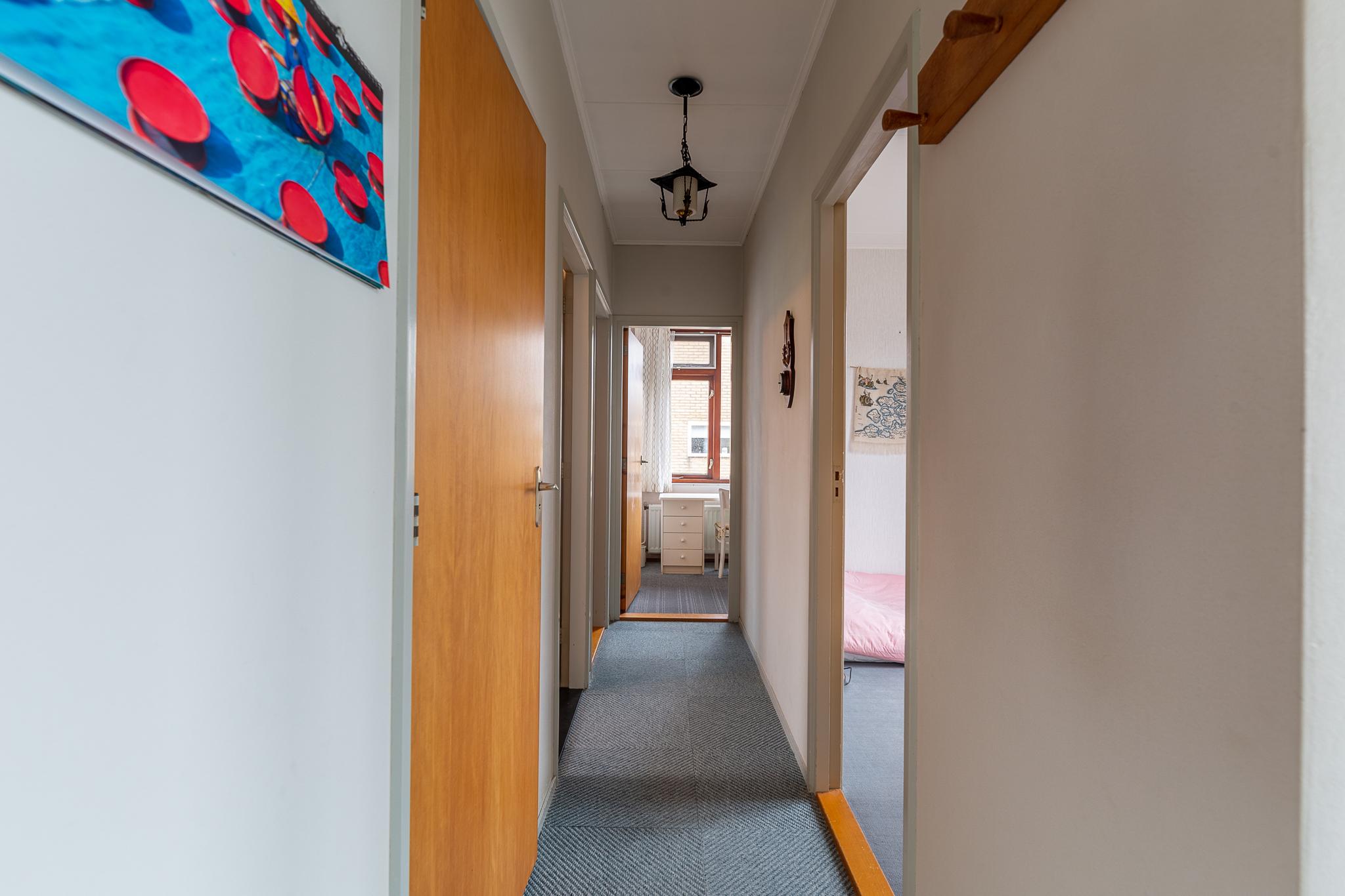 Als we vanuit de hal de gang in lopen passeren we allereerst de toiletruimte met een toilet en fonteintje, een badkamer (met blauwe tegeltjes) met een ligbad met een douche in het bad, 2 wastafels met spiegelkastjes erboven en een aansluiting voor de wasmachine. Vervolgens zijn er 3 slaapkamers, waarvan 2 met vaste kasten. De kamers hebben de volgende afmetingen: 3,31 x 3,2 m¹; 2,05 x 3,04 m¹ en 2,9 x 2,07 m¹. Een royale garage met een oppervlakte van 24 m², voorzien van een elektrische roldeur, completeert de begane grond.