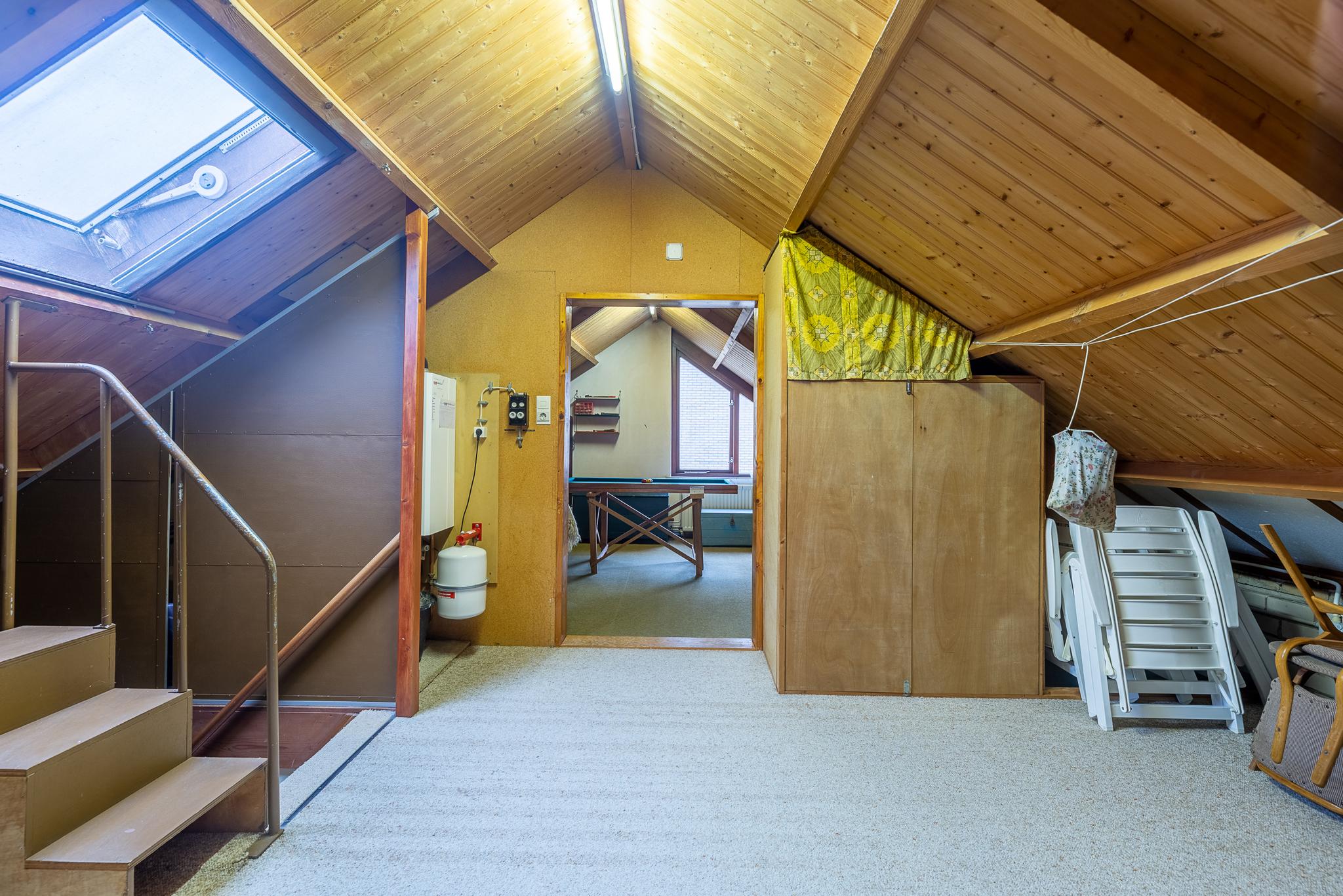 De verdieping is verrassend ruim en is onderverdeeld in een royale overloop/bergruimte waar ook de C.V,-opstelling staat (ca. 17m5 m², gemeten vanaf 1,5 meter hoogte) en aan weerszijden is er een slaapkamer. Beide slaapkamers hebben de afmeting 4,05 x 4,2 m¹ en zijn voorzien van bergruimte achter de schotten in het lage deel van het dak. Een van de kamers is voorzien van een wastafel.