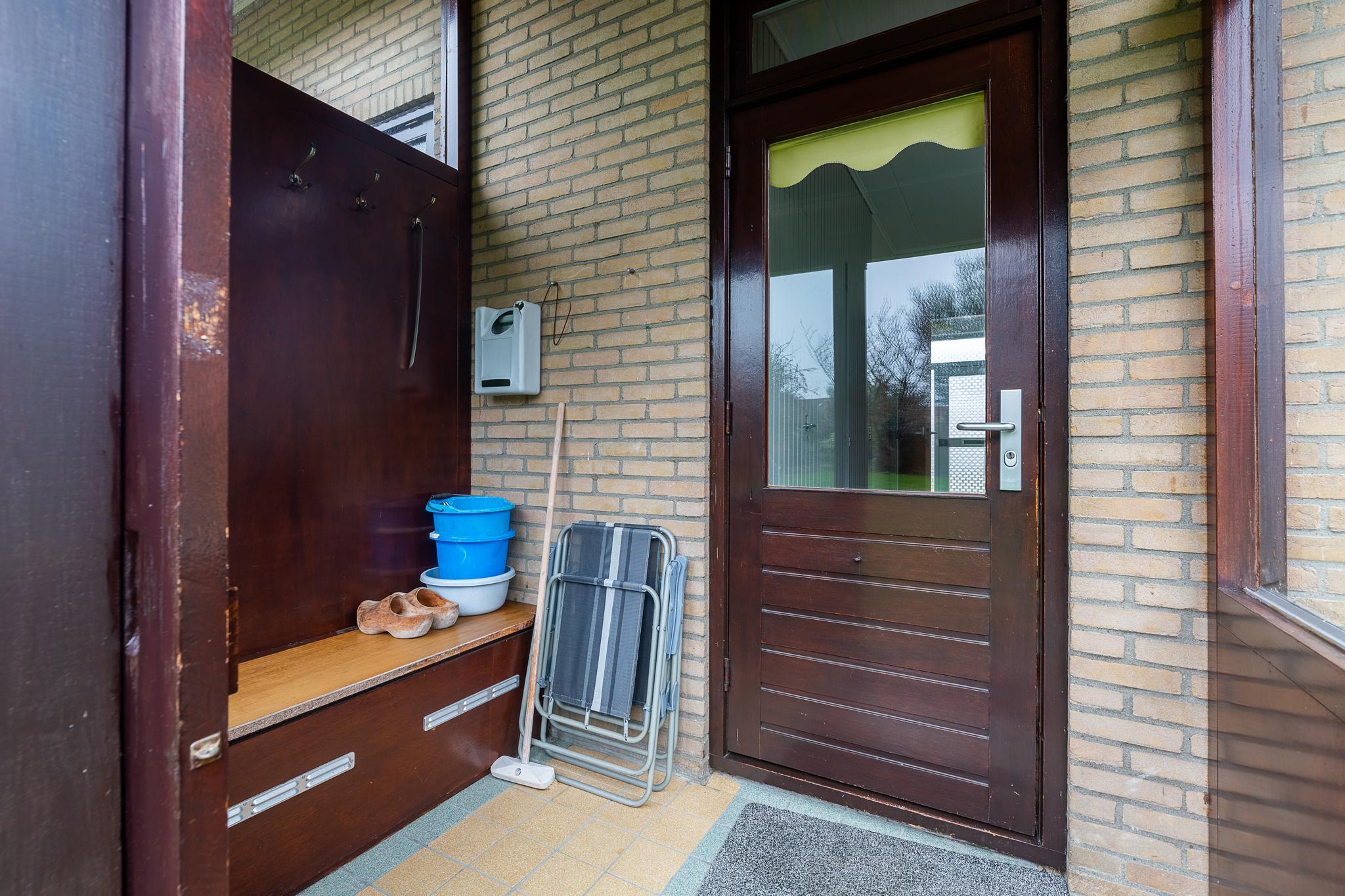 Ruime hal die overgaat in een gang. Hiervandaan zijn alle ruimtes op de begane grond te bereiken. Direct achter de voordeur is de meterkast met 6 groepen en de garderobekast. De living bevindt zich aan de linkerzijde van de gang. Deze L-vormige kamer oogt bijzonder licht en hiervandaan hebt u een weids en bijzonder leuk zicht door de straat en op de riante, groene tuin. De kamer heeft een oppervlakte van ca. 27 m² en staat in directe verbinding met een royale (woon)keuken. Deze heeft een oppervlakte van ca. 15 m². Het L-vormige keukenblok is voorzien van een gaskookplaat, afzuigkap, koelkast en een éénhendelmengkraan. De keuken heeft verder een praktische kelderkast waar u de boodschappen en voorraad kunt bewaren. Ook vanuit de keuken hebt u een mooi zicht op de tuin. De achtertuin is via de serre-aanbouw achter de woning toegankelijk