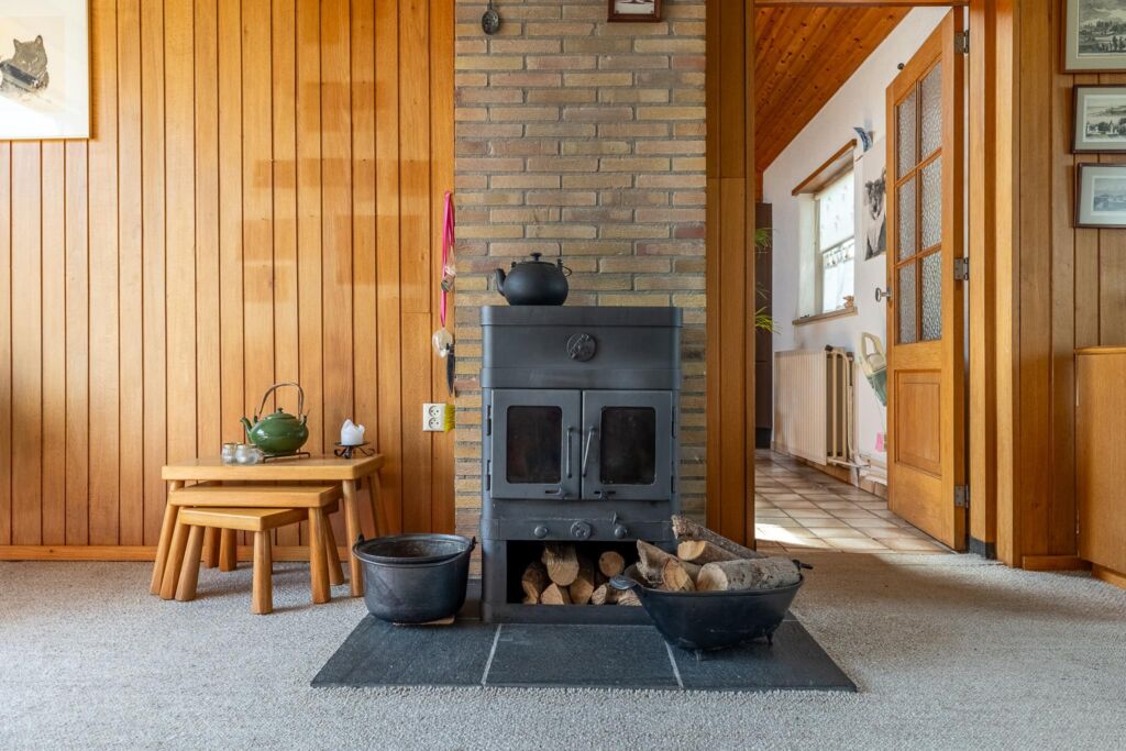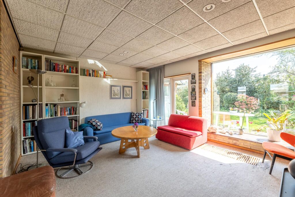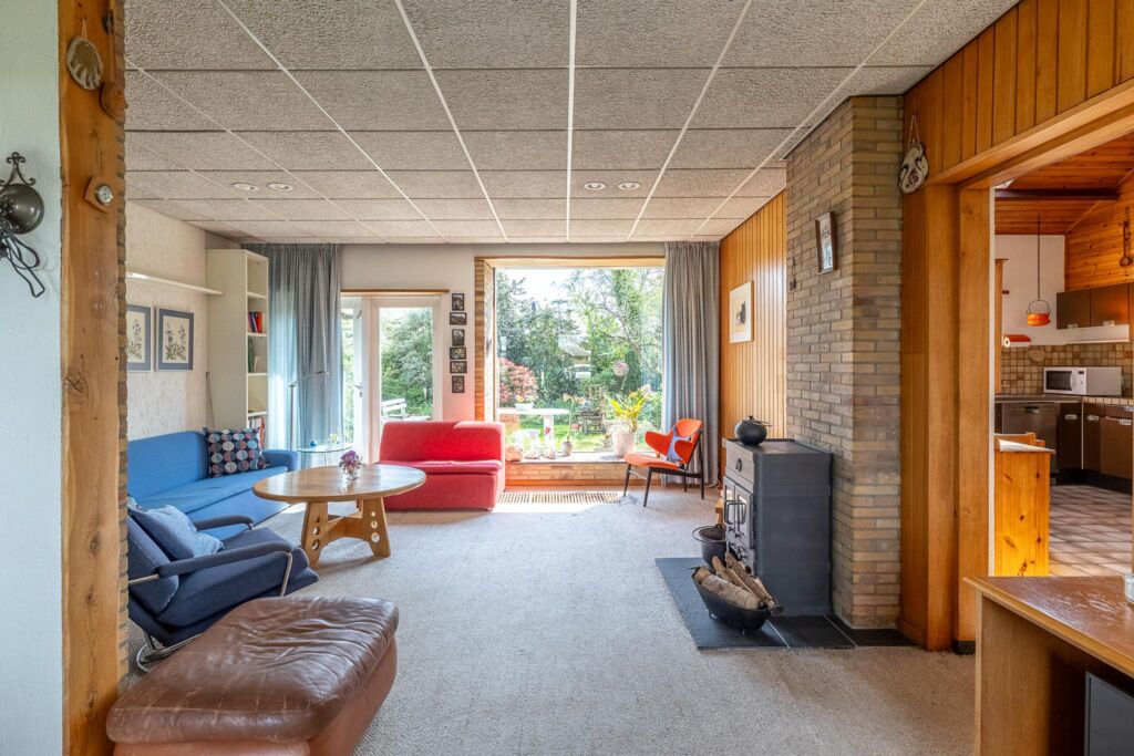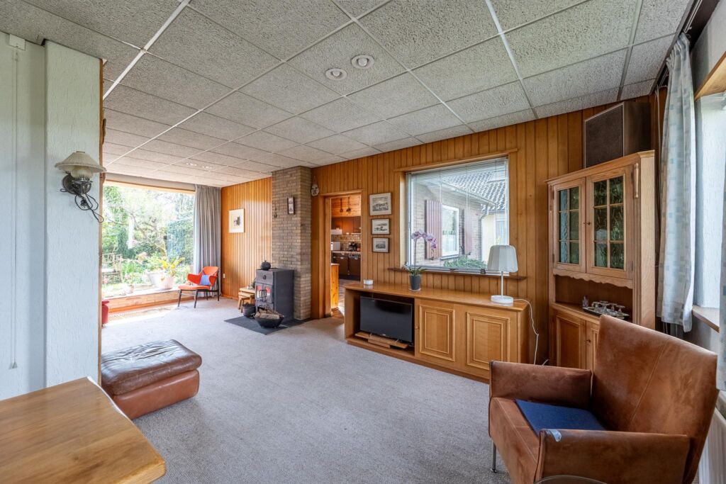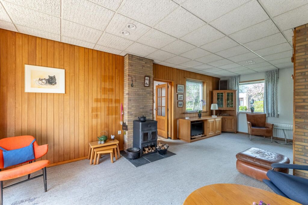 Begane grond: De royale hal, midden in de voorgevel is het centrale punt waar vanaf de meeste ruimtes toegankelijk zijn. Rechts gaat u naar de woonkamer met grote raampartijen en openslaande deuren naar de achtertuin. Deze brede doorzonkamer (afmetingen ca 7,45 x 5,1 meter) oogt bijzonder licht. Opvallend is het kamerhoge raam aan de achterzijde. Hier stroomt op zonnige dagen het zonlicht naar binnen en geniet u van de kleurrijke bloemen, planten en struiken waar dagelijks vele vogeltjes af- en aan vliegen. U hebt dan eerder het idee dat u in de vrije natuur bent in plaats van in een woonwijk. De warme sfeer van gezelligheid in de woning wordt versterkt door de houtkachel die tevens voor een behaaglijke warmte zorgt op de killere dagen. Dit is echt een ruimte om tot rust te komen en gezellig met elkaar te zijn. De aangrenzende keuken is met een oppervlak van ca. 19m² royaal te noemen. De huidige keuken heeft een hoekopstelling en is voorzien van diverse inbouw apparatuur. De keuken heeft al vele jaren dienst gedaan. In deze ruimtelijke keuken is het aan u om uw ideale woonkeuken te realiseren, een plek waar iedereen samen komt voor de maaltijd en een goed gesprek. Via de keuken kunt u eveneens de achtertuin bereiken.