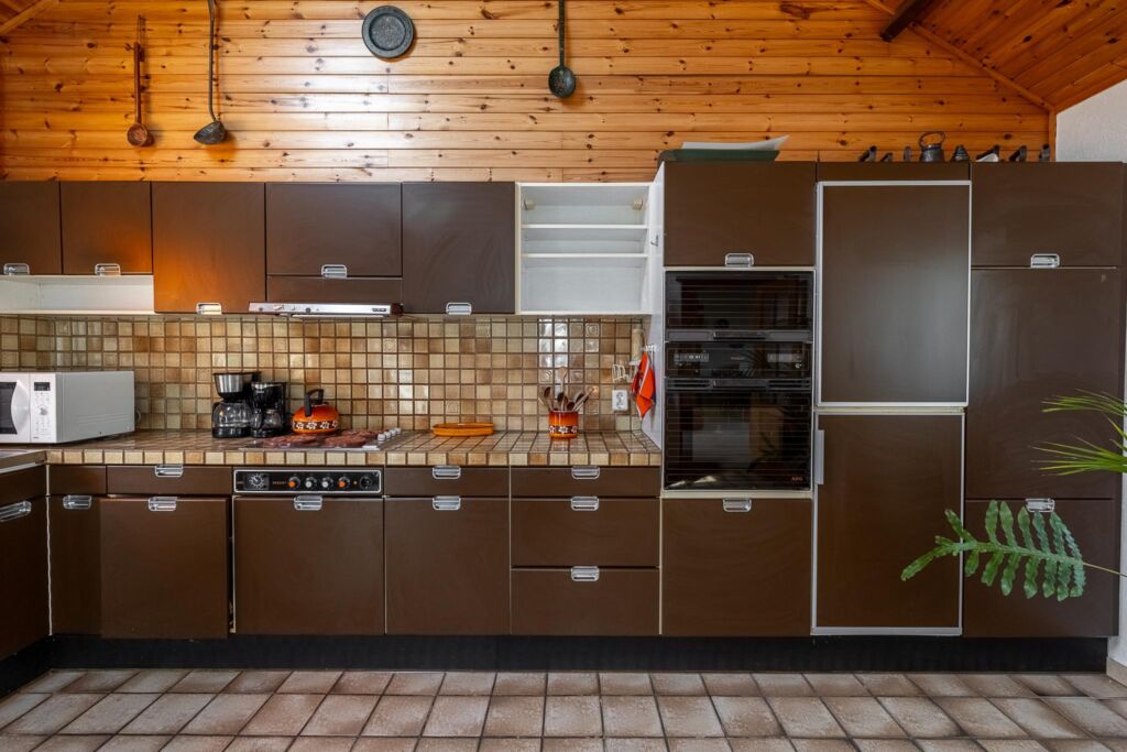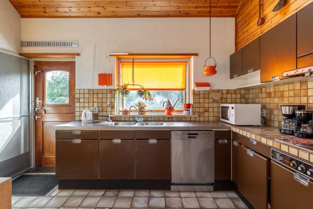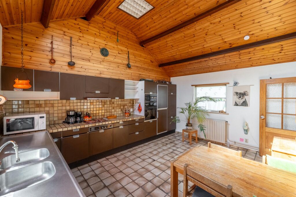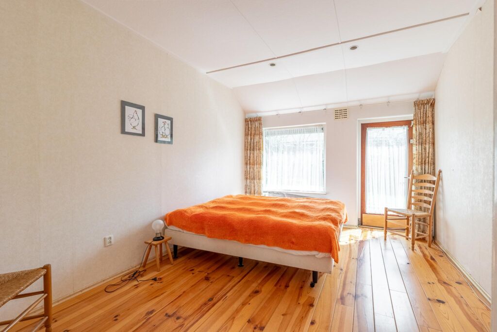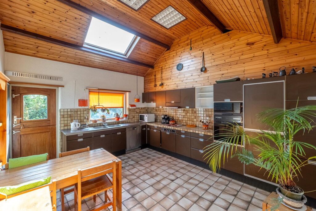 Begane grond: De royale hal, midden in de voorgevel is het centrale punt waar vanaf de meeste ruimtes toegankelijk zijn. Rechts gaat u naar de woonkamer met grote raampartijen en openslaande deuren naar de achtertuin. Deze brede doorzonkamer (afmetingen ca 7,45 x 5,1 meter) oogt bijzonder licht. Opvallend is het kamerhoge raam aan de achterzijde. Hier stroomt op zonnige dagen het zonlicht naar binnen en geniet u van de kleurrijke bloemen, planten en struiken waar dagelijks vele vogeltjes af- en aan vliegen. U hebt dan eerder het idee dat u in de vrije natuur bent in plaats van in een woonwijk. De warme sfeer van gezelligheid in de woning wordt versterkt door de houtkachel die tevens voor een behaaglijke warmte zorgt op de killere dagen. Dit is echt een ruimte om tot rust te komen en gezellig met elkaar te zijn. De aangrenzende keuken is met een oppervlak van ca. 19m² royaal te noemen. De huidige keuken heeft een hoekopstelling en is voorzien van diverse inbouw apparatuur. De keuken heeft al vele jaren dienst gedaan. In deze ruimtelijke keuken is het aan u om uw ideale woonkeuken te realiseren, een plek waar iedereen samen komt voor de maaltijd en een goed gesprek. Via de keuken kunt u eveneens de achtertuin bereiken.