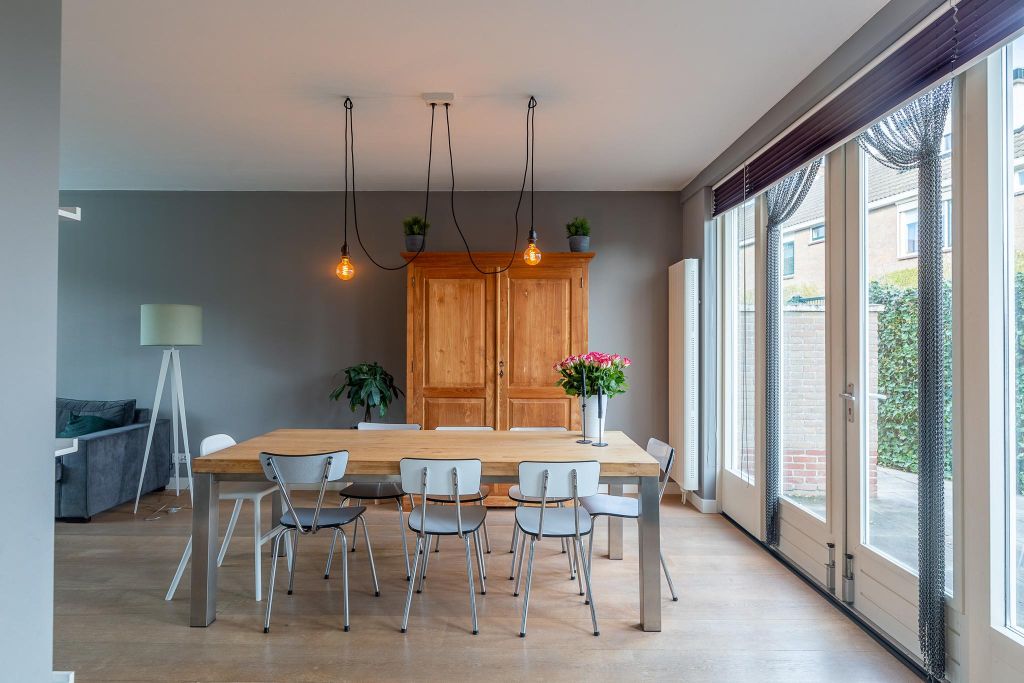 Onder de trap is een trapkast aanwezig voor extra bergruimte. Vanuit de hal betreedt u de ruime en lichte woonkamer. Dit betreft een ruimte die eveneens "af" is. Door de eikenhouten vloerdelen straalt deze een warme en gezellige sfeer uit waardoor er een huislijk gevoel ontstaat. De woonkamer heeft zowel aan de voorzijde als aan de achterzijde grote raampartijen met een prettige lichtinval. Aan de achterzijde bestaan deze uit openslaande deuren waardoor u op de mooie dagen de woonkamer kunt verlengen tot in de tuin. De open keuken heeft een keukenopstelling in U-vorm en is voorzien van allerhande inbouw apparatuur waaronder een 5 gaskookplaat met wokbrander (gas op glas) en een brede RVS afzuigkap, combi-oven, vaatwasser, koel-vries combinatie. De keuken is uitgevoerd met gladde greeploze deurtjes en lades voorzien van soft close systeem. De keuken wordt verlicht middels spotjes die in het verlaagde plafond verwerkt zijn.
