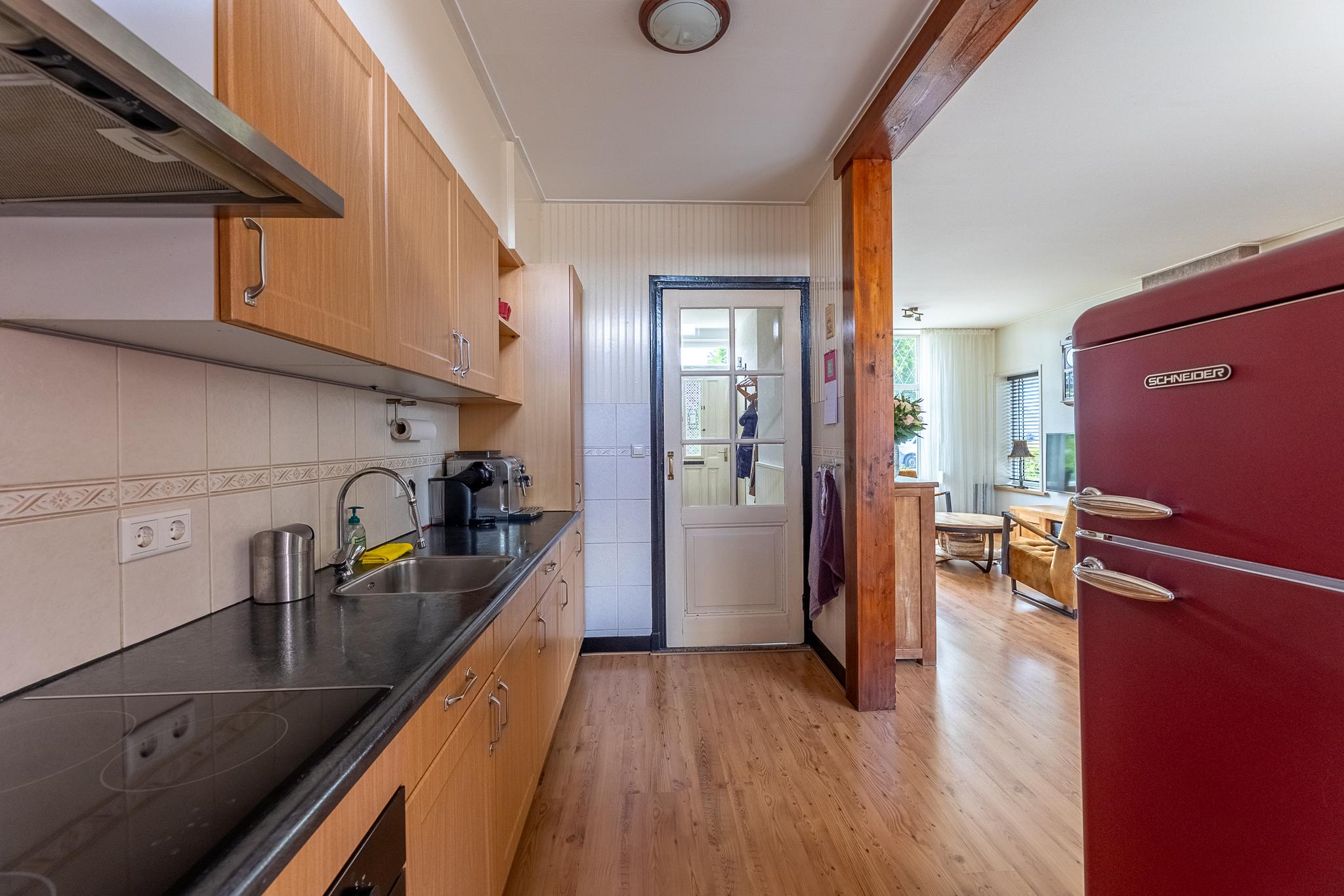 De open keuken heeft recht keukenblok met een 4-pits inductie kookplaat, een ingebouwde oven, een afzuigkap, type schouwkap en kastruimte.