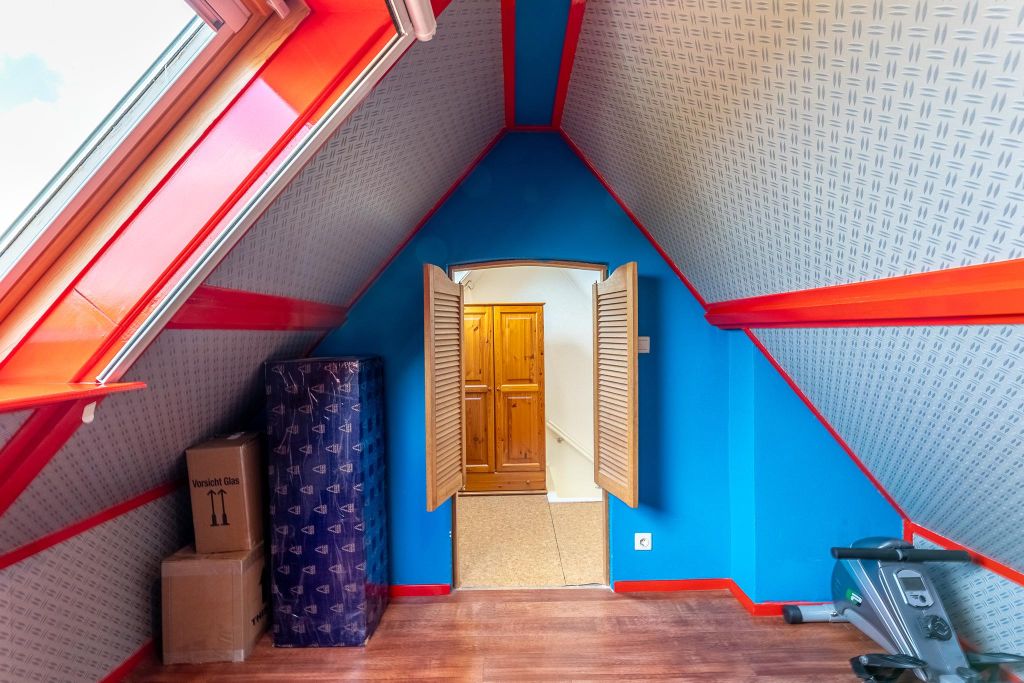 Via een houten open trap kom je op de 2e verdieping. Hier is een overloop en is er onder de schuine kap een extra slaapkamer gerealiseerd (met Veluxraam en verwarming).