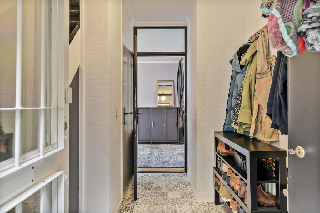De entree is aan de linker zijgevel van de woning. Hier is een hal met meterkast en de toiletruimte met toilet en fonteintje.