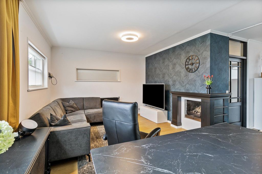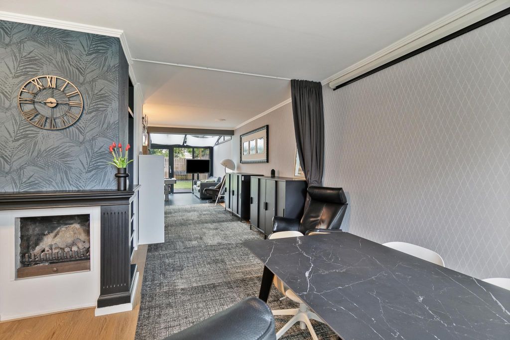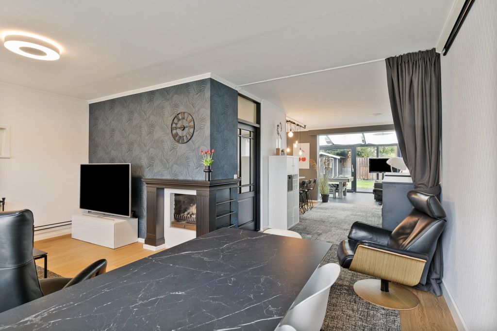 De L-vormige woonkamer is heerlijk ruim. Aan de voorzijde is plaats voor een grote zithoek rondom de haardpartij (er is gaselement in de haard geplaatst). Naar achter toe is een tuingerichte eetkamer naast de open keuken.