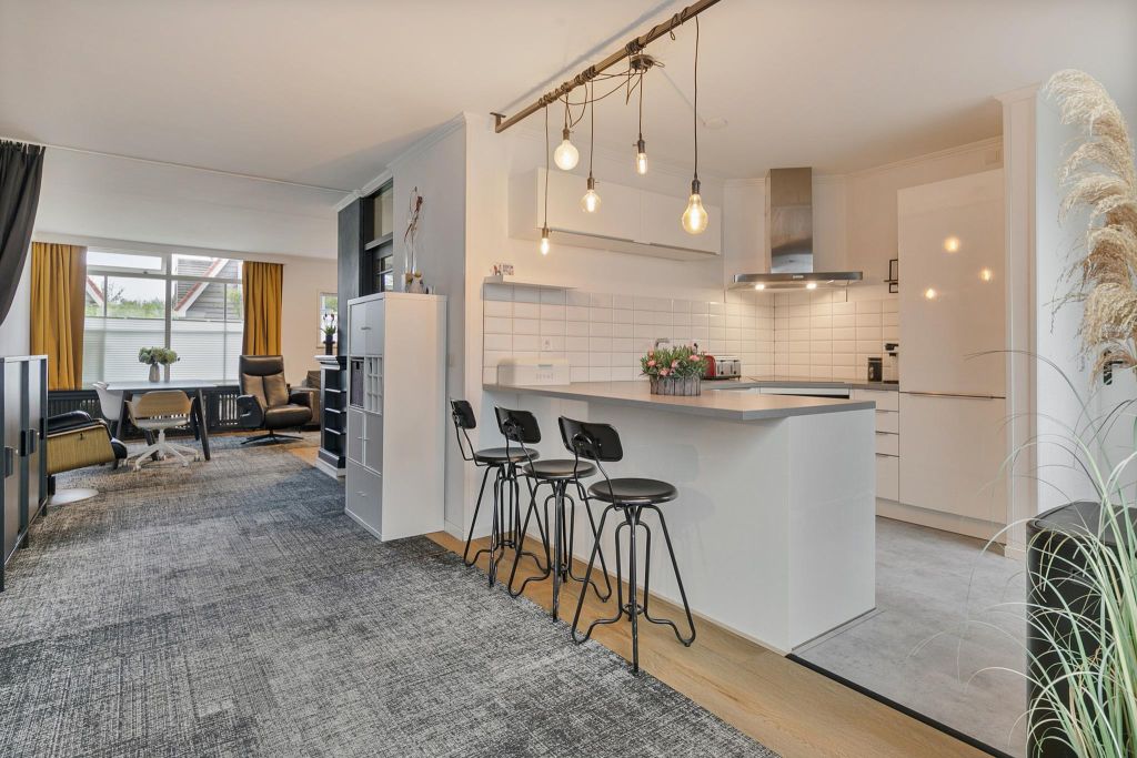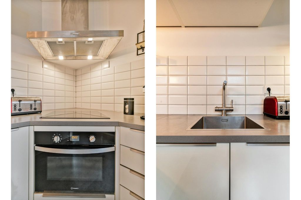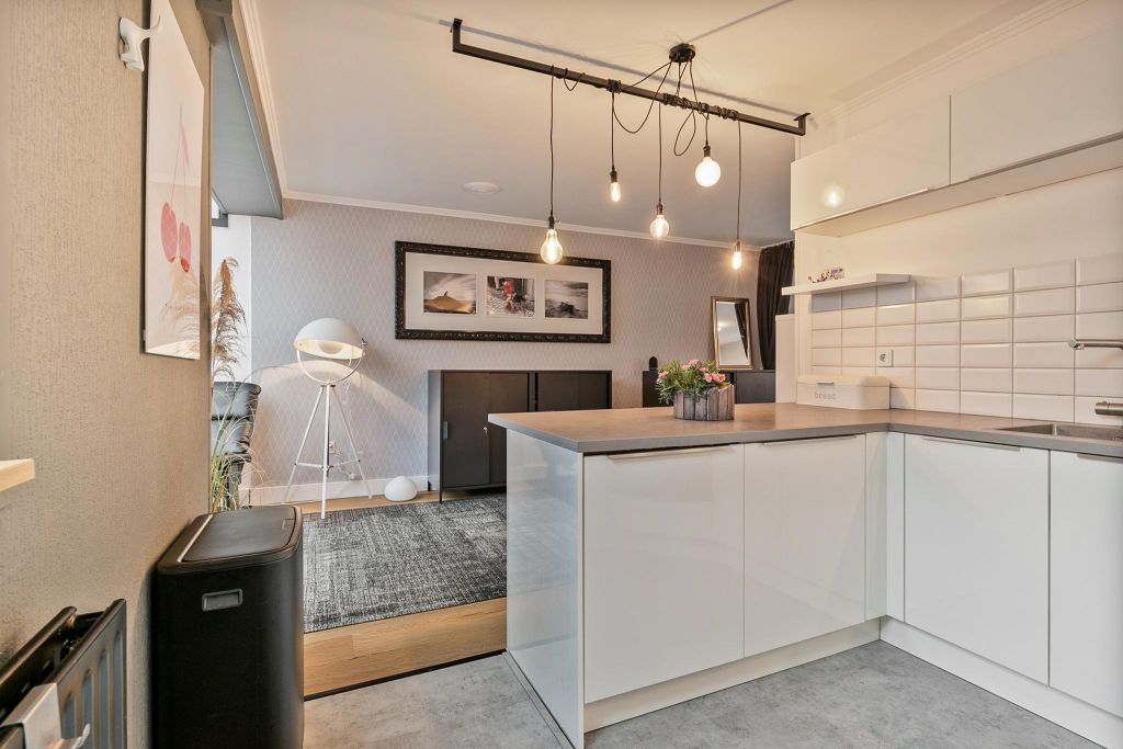 De open keuken is geplaatst in een U-vorm (in 2019) met fraaie witte kasten, een grijs aanrechtblad en uitgebreide inbouwapparatuur.
