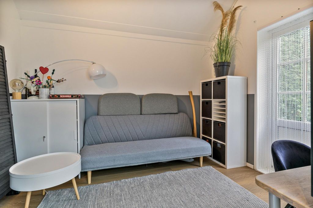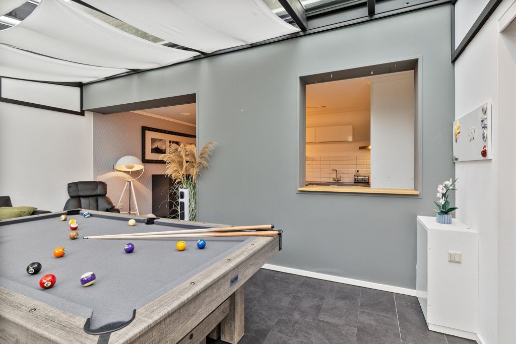 Naar achter toe is een extra kamer bereikbaar. Deze kamer kan als slaapkamer dienen, maar ook is het een ideale thuiswerkplek of hobbykamer. De serre, grotendeels uit glas bestaand, doet nu dienst als hobby-/speelruimte maar is ook prima te gebruiken als eetkamer met zicht over de achtertuin.