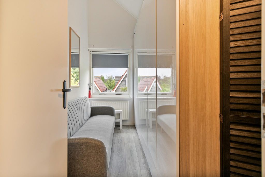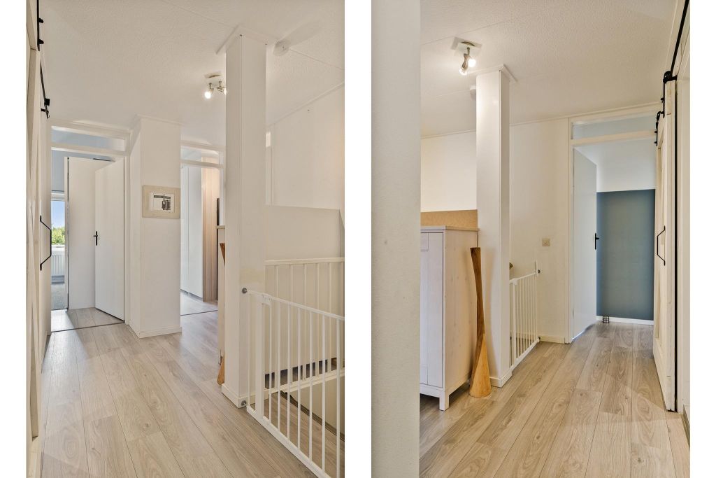 Op de verdieping zijn vier slaapkamers te vinden. Oorspronkelijk waren dit drie slaapkamers, maar de kamer aan de achterzijde is gesplitst in twee kamers. Deze splitsing is overigens zeer eenvoudig weer terug te draaien als er behoefte is aan een grotere slaapkamer.