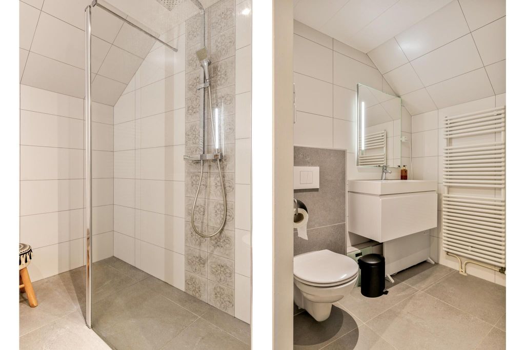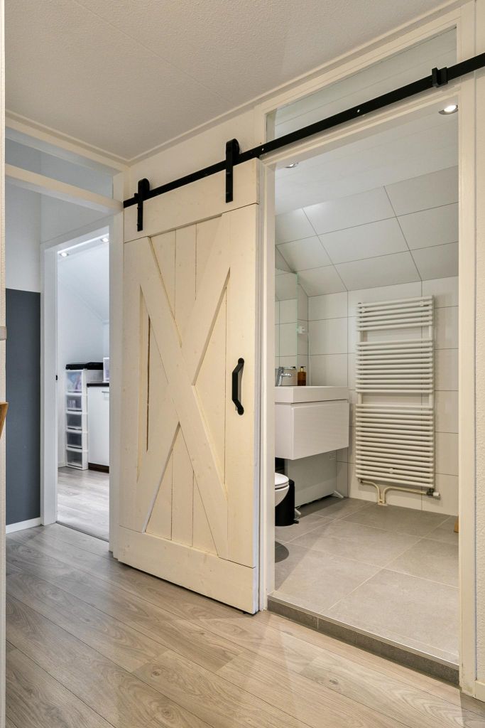 De badkamer (uit 2018) is voorzien van een barndeur (Houten ‘staldeur” op rail met wielconstructie) en is uitgevoerd met een toilet, douche en wastafel in een badmeubel.