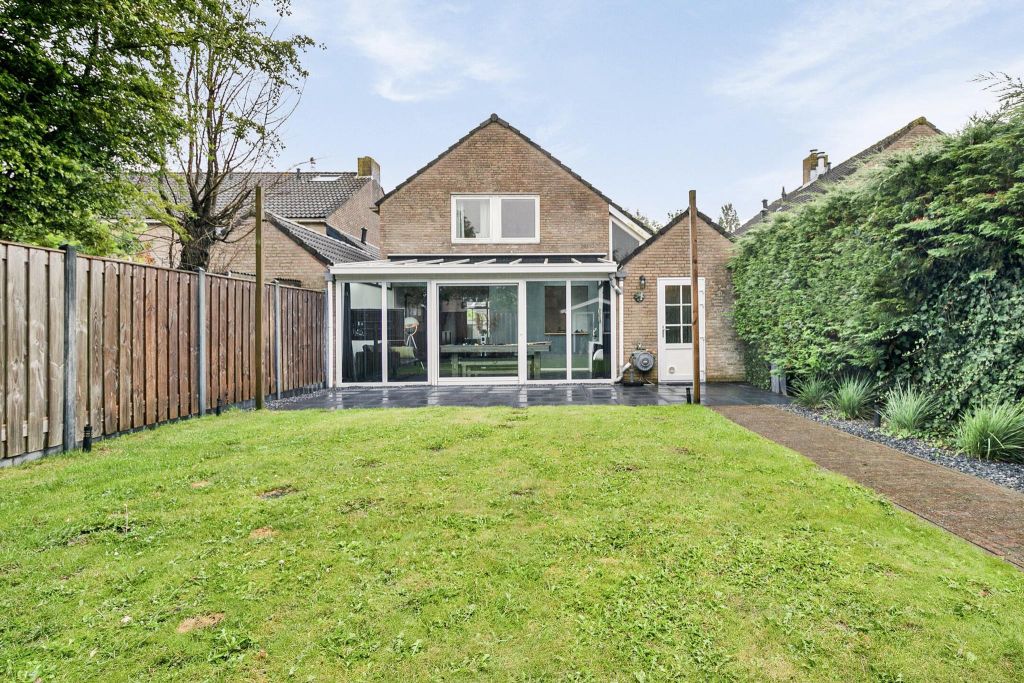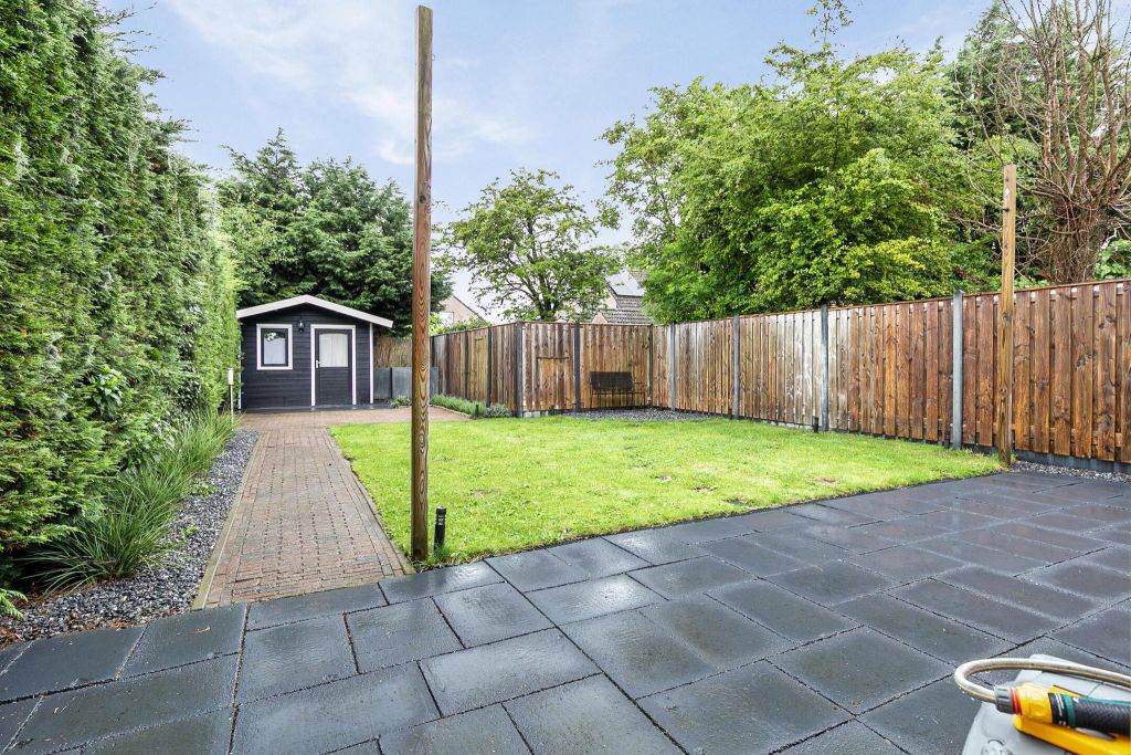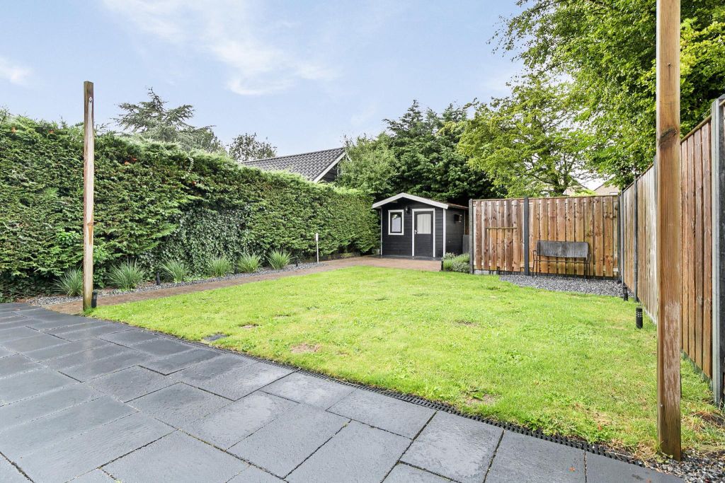 Aan de achterzijde is een fijne tuin met terras en groot gazon, omzoomd door schuttingen. Achter in de tuin staat een houten tuinhuis.