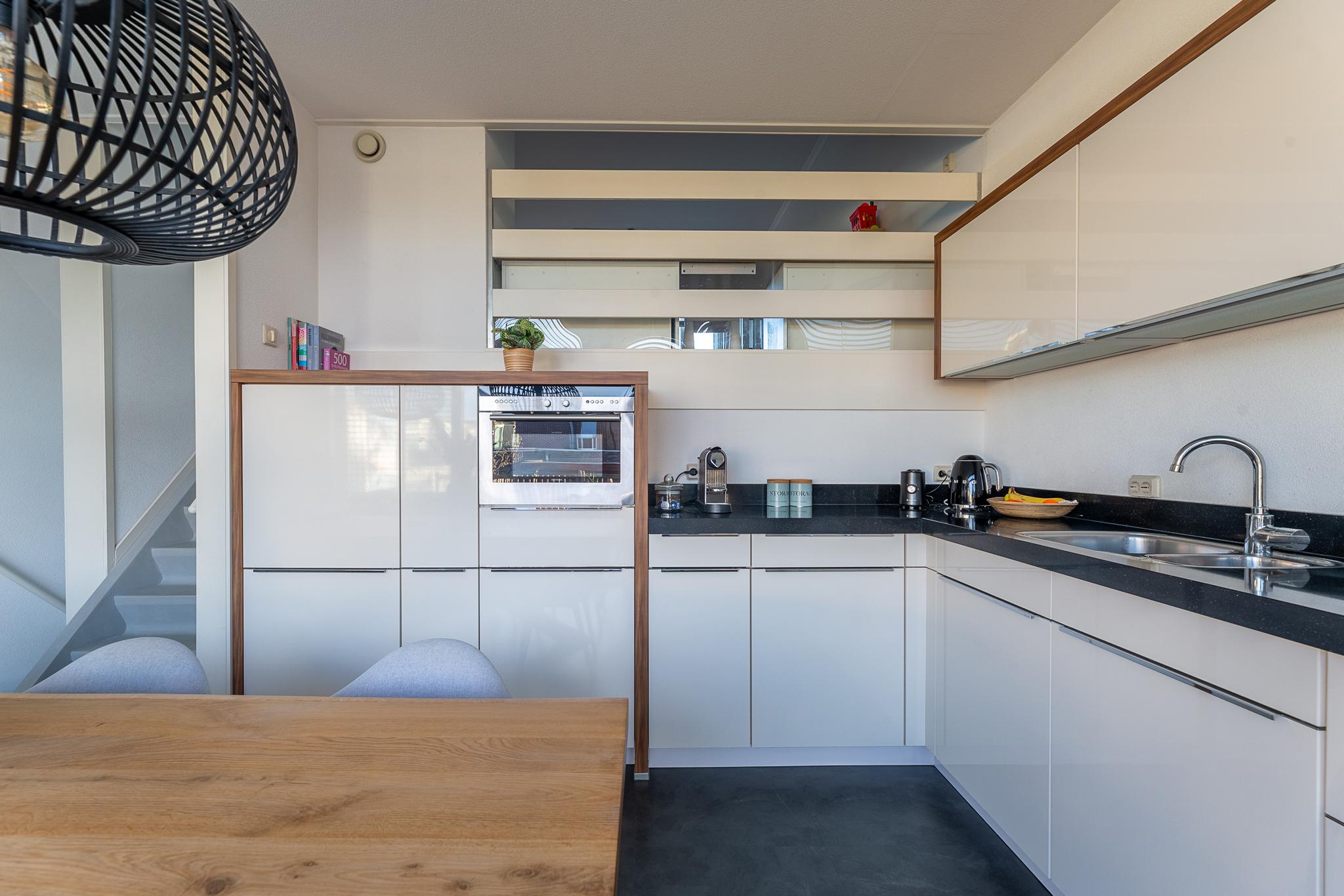 Op dit niveau bevindt zich een royale woonkeuken. Deze heerlijke ruimte is terras-/tuingericht en voorzien van openslaande deuren naar het terras met een woningbreed zonnescherm. De keuken is voorzien van een moderne keukeninrichting in hoekopstelling en uitgerust met alle denkbare inbouwapparatuur zoals een keramische kookplaat, RVS afzuigkap (90 cm breed) vaatwasser, koelkast met vriesvak en combimagnetron/oven. Het werkblad is van zwart graniet en vormt een mooi contrast met de witte kastfrontjes. De woonkeuken is een heerlijke plek om lekker te genieten en om de dag te bespreken.