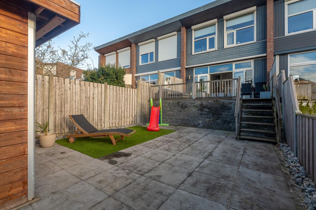 Ook de tuin is verdeeld over twee niveau's: Op niveau 1 (keukenniveau) is een heerlijk riant vlonderterras. Hier geniet u vanuit uw tuinmeubelen set van het fraaie uitzicht over de achtergelegen waterpartij. Een niveau lager is het tweede deel van de tuin. Dit deel is voorzien van grote hardstenen bestrating. De tuin is omsloten door houten schuttingen en heeft een vrije ontsluiting via de achtergelegen, afgesloten brandgang. Via de achtertuin kunt u ook de achtergelegen waterpartij bereiken.
