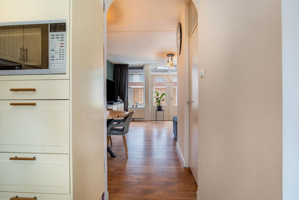 Hal met meterkast (4 groepen en slimme meters), trapkast en recent opnieuw betegelde toiletruimte met modern hangend toilet. Er is een tuingerichte woonkamer met royaal plaats voor een grote zithoek. Ook is er een lange muur waar grotere wandmeubels geplaatst kunnen worden en er is voldoende ruimte voor een grote eethoek. Openslaande deuren naar de tuin verbinden de woonkamer met het terras in de tuin. Middels een boog komt u in de keuken (voorzijde van de woning). De keuken is royaal met veel kastruimte en voorzien van de nodige apparatuur, maar de keuken zal één van de ruimtes zijn die u gaat vernieuwen. Aan apparatuur is er een gaskookplaat, oven, afzuigkap, magnetron, quooker en een losse vaatwasser en koel-vriescombinatie.